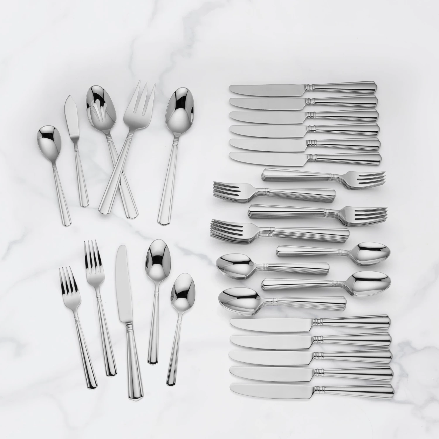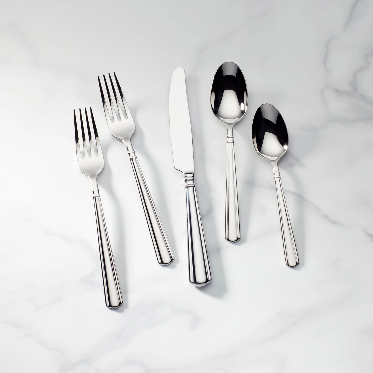 The Amber Hill flatware set features simple lines along the handle that end in an elegant scallop, creating a curtained effect. Crafted from brilliant 18/10 stainless steel, this high quality flatware set is both durable and dishwasher safe, making it ideal for everyday use. This large set has everything you need in one and can be used for both casual and formal occasions.