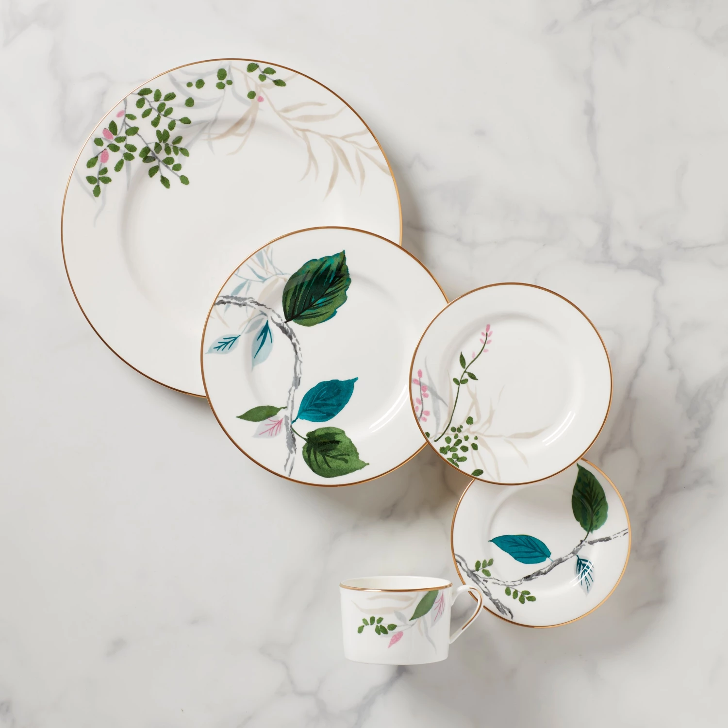Delicate watercolor-inspired florals give a hand-painted feel to this Birch Way collection for a whimsical accent to fine dining. This 5-piece place setting is crafted of durable white bone china, with 24k gold accents, and is both dishwasher-safe and tarnish-resistant.