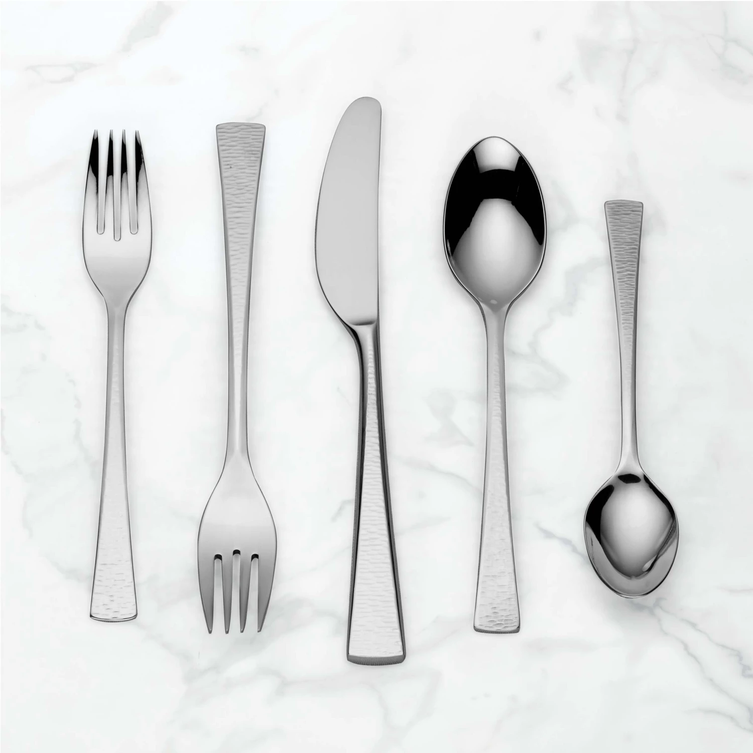 The elegant and stylish Biscayne 65-piece Flatware Set is crafted of durable 18/10 stainless steel, and features intricate hammered steel handles. This elaborate and ornate silverware set includes twelve dinner forks, salad forks, dinner knives, tablespoons, and teaspoons, in addition to a serving spoon, pierced serving spoon, sugar spoon, butter knife, and serving fork.
