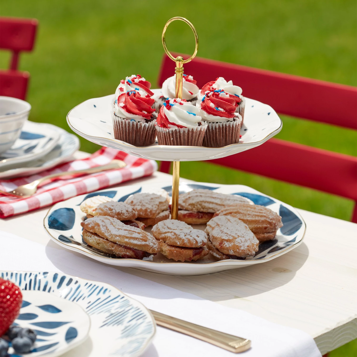 Serve macaroons, cookies and other pastry treats on the Blue Bay two-tiered server. Featuring sweet dots and organically-shaped leaves, this gold-banded server is perfect to add height to your spread.
