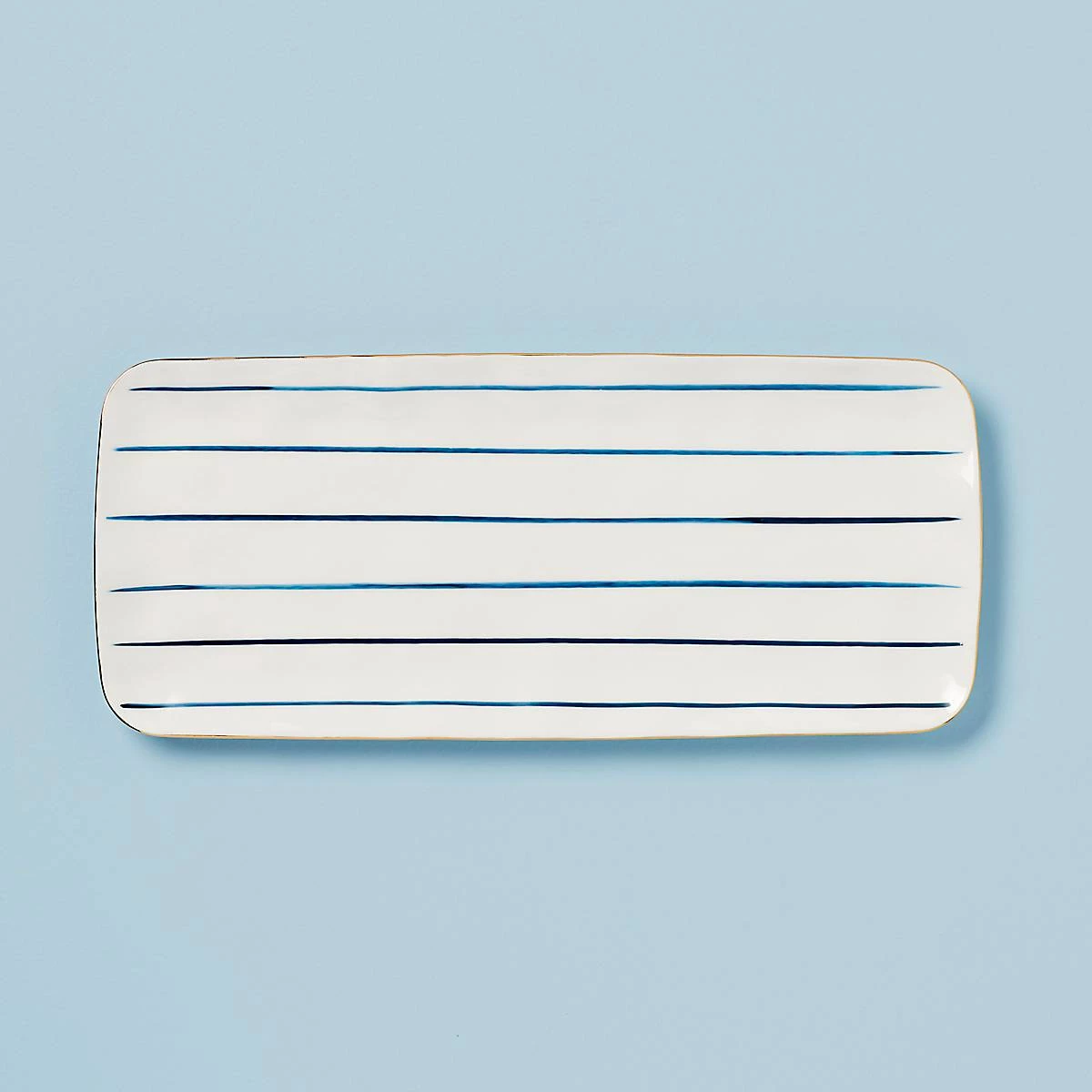 The Blue Bay hors d’oeuvre tray is ideal for serving delicious desserts, and can also be used as a server for smaller side bowls for a charming effect. Featuring a delicate stripe pattern and thin gold accent, this tray is perfect for any dessert spread.