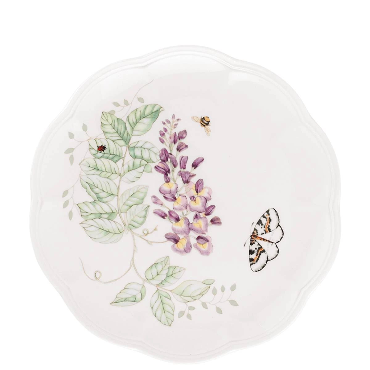 A lively butterfly and bee buzz about a soft floral design on the Butterfly Meadow 9″ Accent Plate. The trademark design features elegant scalloped edges on durable white porcelain. This mix-and-match classic is crafted for outstanding freezer-to-oven-to-table performance. This durable ceramic porcelain plate is microwave and dishwasher-safe, and features handsome scalloped edges.