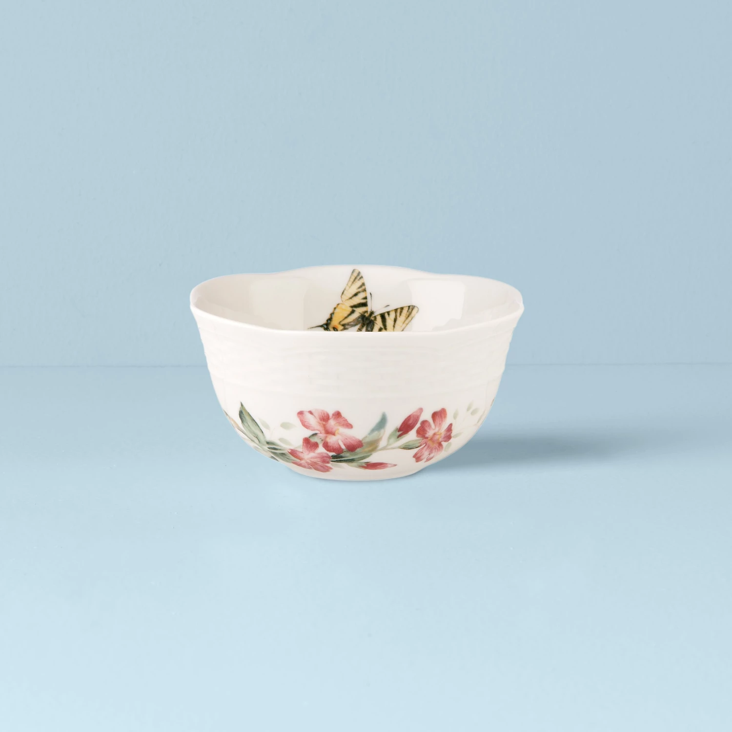 The delightful and modern Butterfly Meadow Basket Bowl features an exquisite nature motif of a butterfly fluttering above soft pink flowers. Crafted from durable ceramic porcelain, this bowl is dishwasher-safe for added convenience.