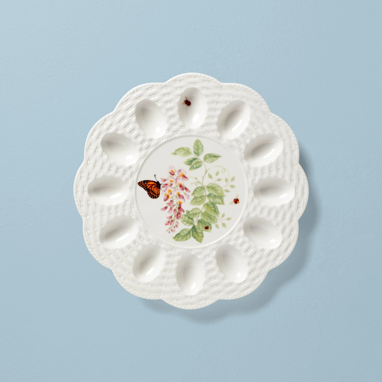 Make a pretty display out of your deviled eggs with this flower egg tray from our Butterfly Meadow collection! Featuring basketweave detail and a beautiful floral pattern, this pretty piece elevates your hors d’oeuvres with its unique design and room for up to 12 eggs.