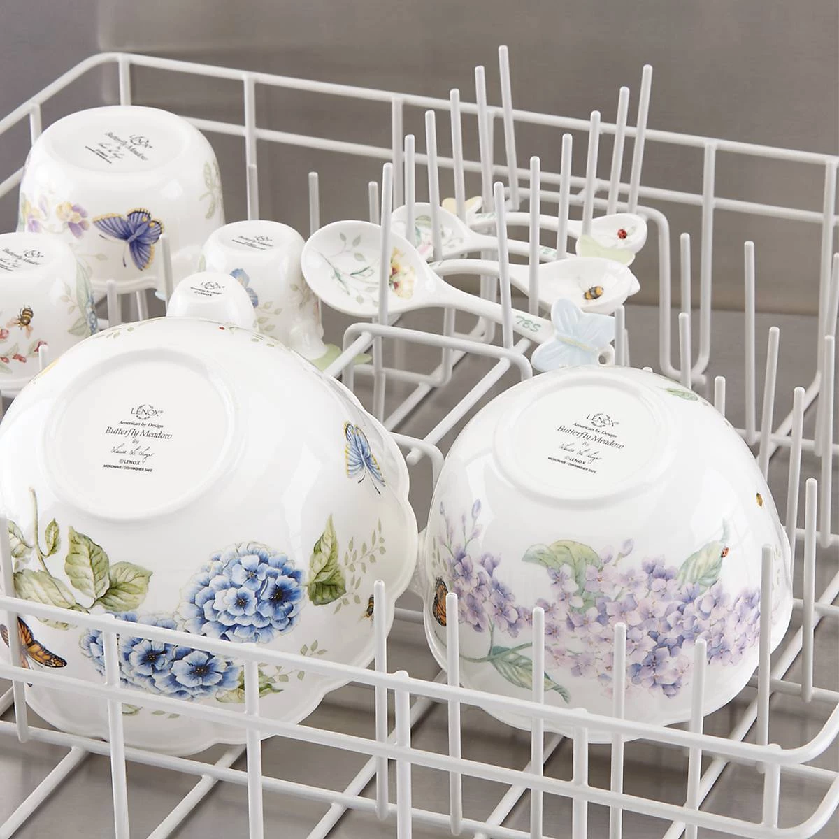 Crafted of durable white ceramic porcelain, the Butterfly Meadow 2-piece Nesting Bowl Set features a bright and vibrant motif of butterflies and blossoming flowers. Ideal for mixing and preparing a meal, this set is microwave and dishwasher-safe, for added convenience.