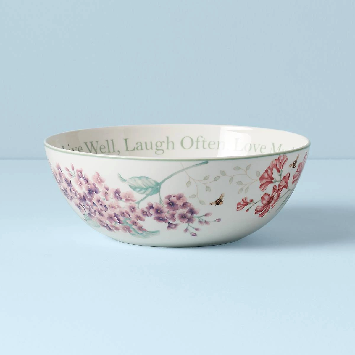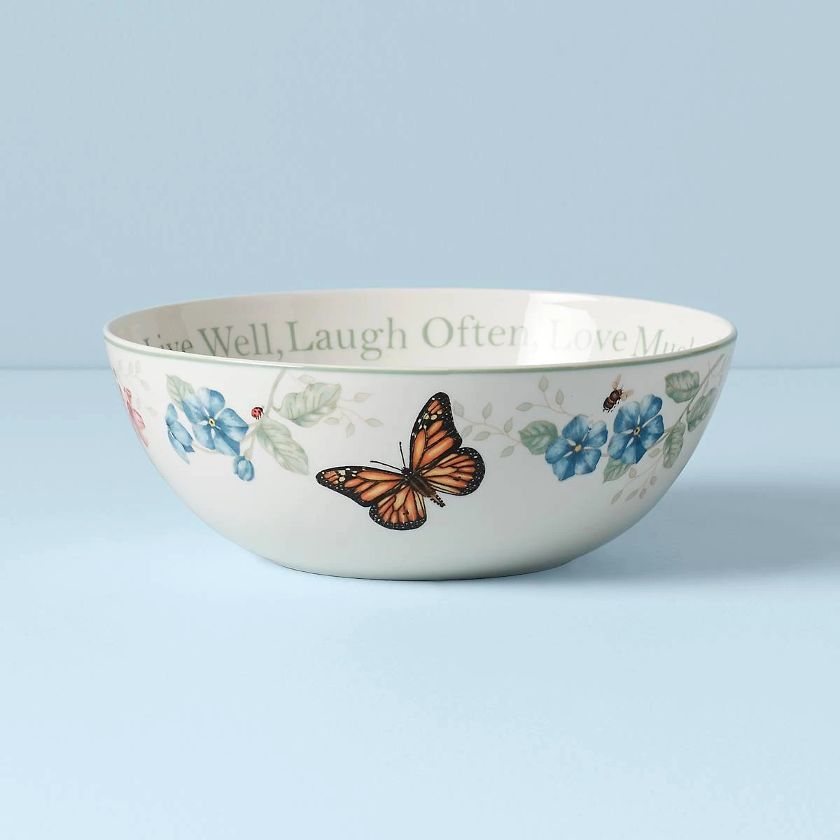 “Live Well, Laugh Often, Love Much” circles the Butterfly Meadow Large Serving Bowl’s interior, while a vibrant floral arrangement decorates the exterior. Made from durable white ceramic porcelain, this bowl is dishwasher and microwave-safe .