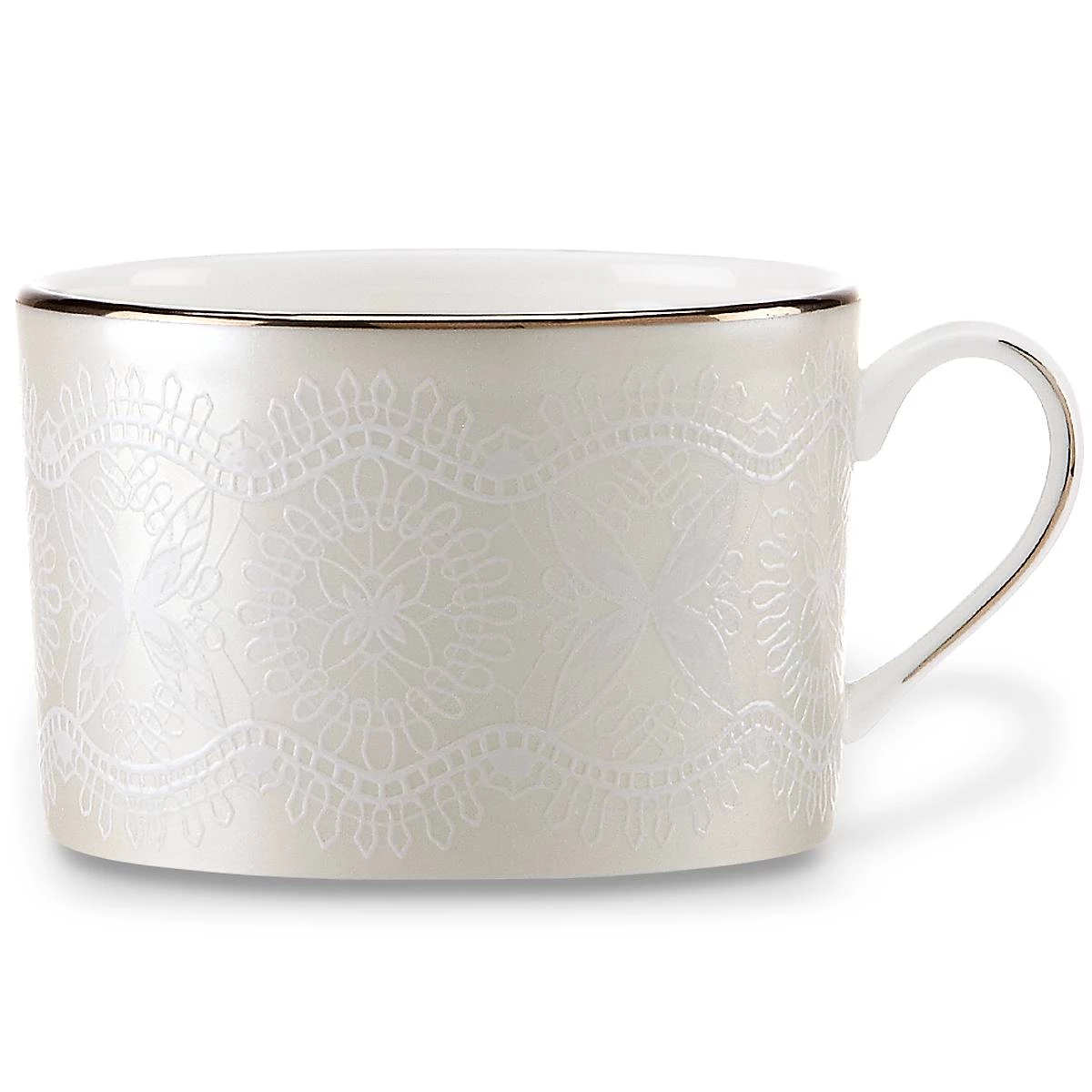 Delight future dinner guests with this chic new collection of durable white bone china. The Chapel Hill Cup is trimmed with a delicate chantilly lace design, that evokes romance, whimsy and vintage wedding veils. This dish features accents in precious platinum, and is dishwasher-safe.