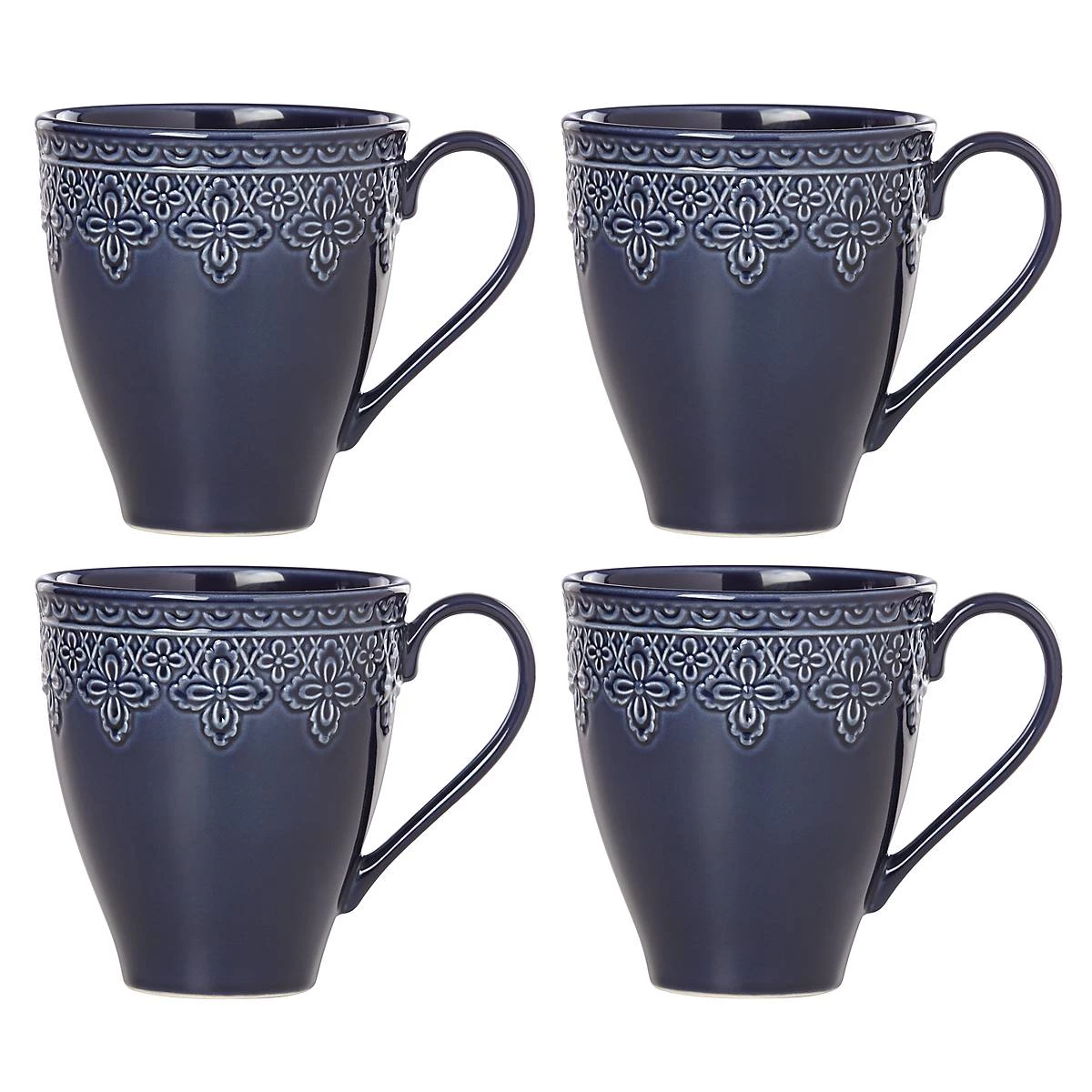 Reminiscent of French matelassé technique, The Chelse Muse Fleur Navy 4-piece Mug Set boasts an intricate quatrefoil pattern carved around the edges with a reactive glaze. This rich navy ironstone dinnerware is dishwasher and microwave-safe.