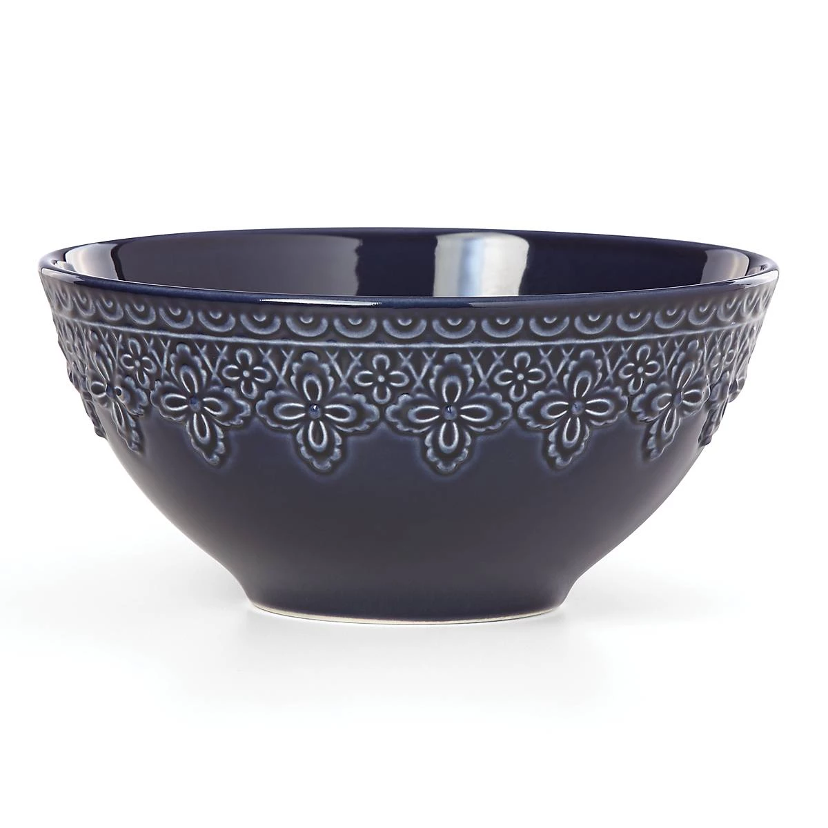 Reminiscent of French matelassé technique, The Chelse Muse Fleur Navy All-Purpose Bowl boasts an intricate quatrefoil pattern carved around its rim with a reactive glaze. Ideal for snacks and tabletop serving, this rich navy ironstone dinnerware is dishwasher and microwave-safe.