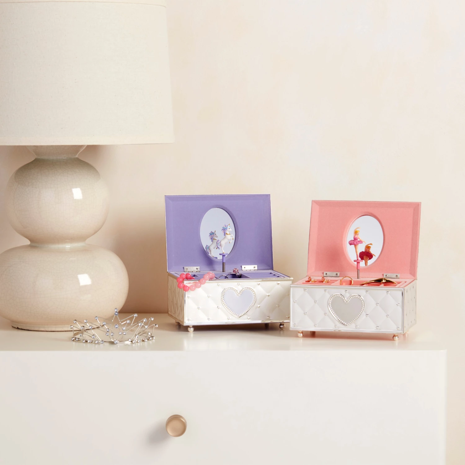 With a graceful ballerina that spins in front of a mirror, the Childhood Memories jewelry box is perfect for the aspiring dancer. Its charming outer shell opens to a soft pink felt interior with several compartments for storing prized jewelry and trinkets. Plays “Für Elise.”