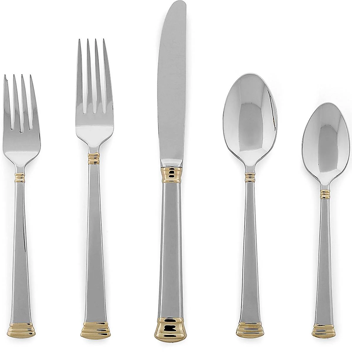 This five-piece place setting, crafted of 18/10 stainless steel, includes raised bands of 24-karat gold along the handles, for a brilliant touch of texture and shimmer. With its smooth, modern lines, the set looks splendid with contemporary dinnerware, and includes a dinner fork, dinner knife, salad fork, tablespoon, and teaspoon.