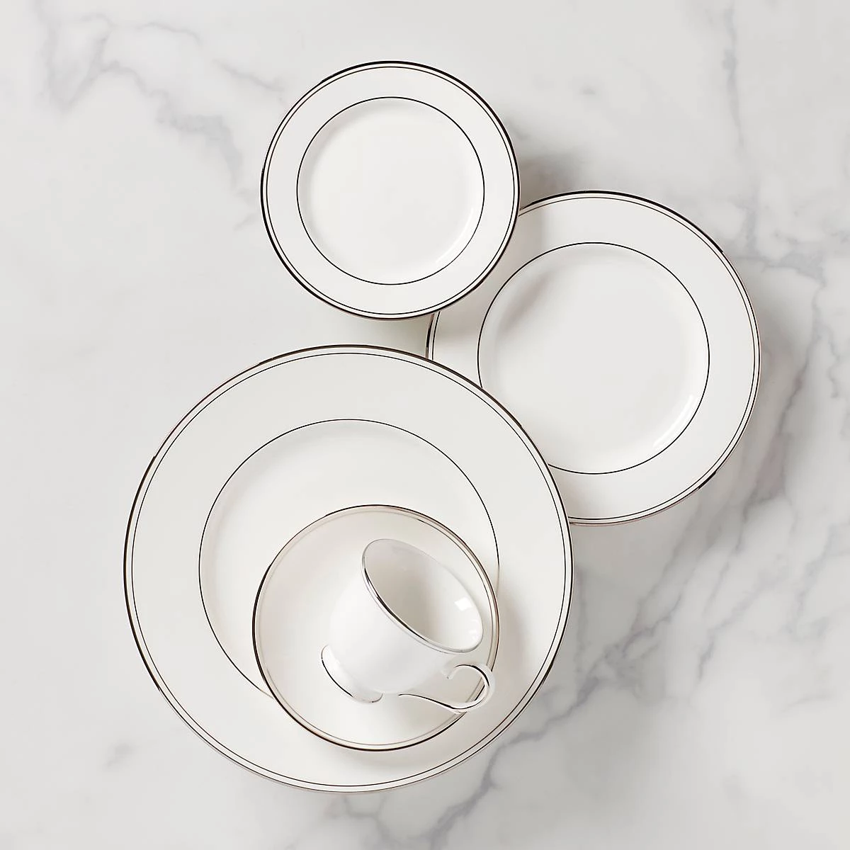 Crafted in durable porcelain nd featuring shimmering platinum accents along the rim, this five-piece place setting is a graceful complement the table and includes a cup and saucer. This item is dishwasher-safe, for added convenience.