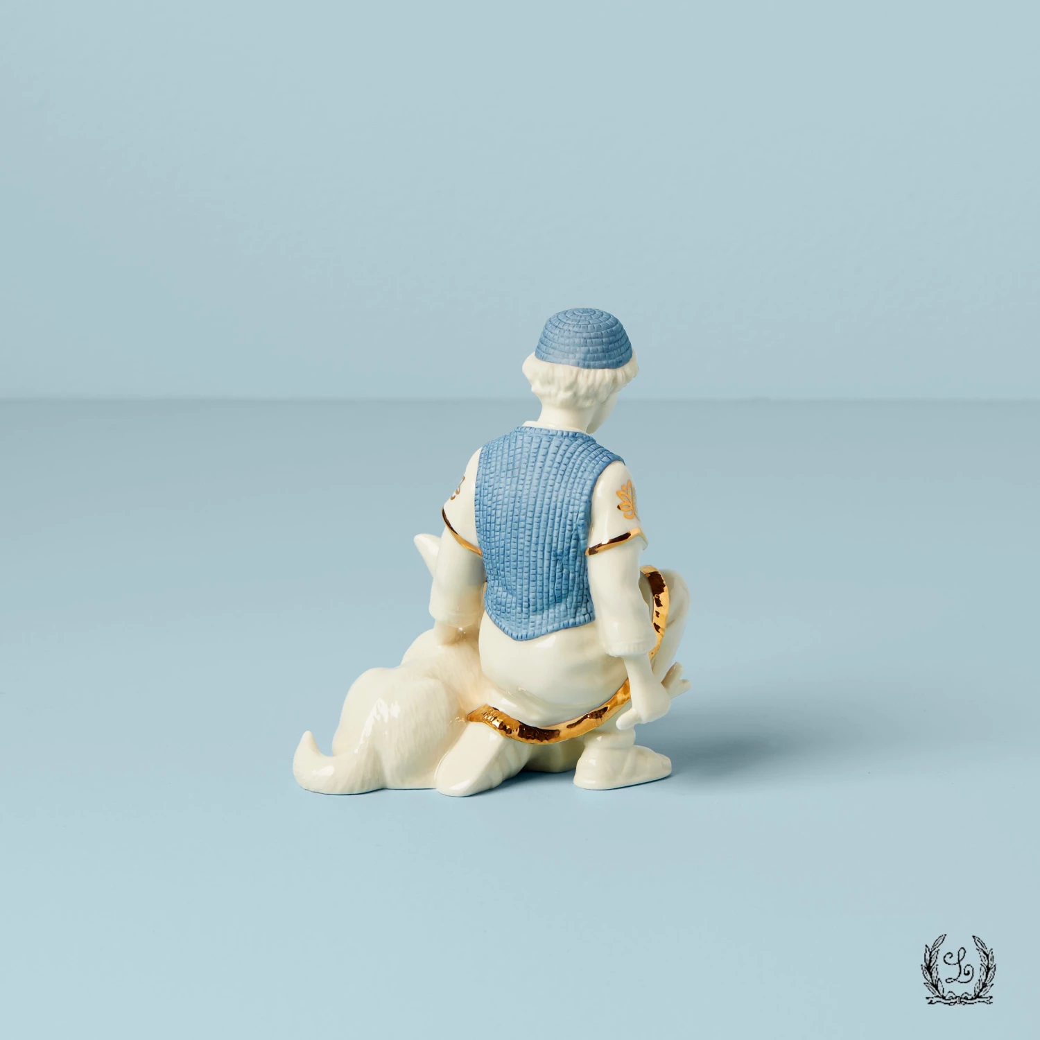 This pristine ivory ceramic figurine features a shepherd boy in a turquoise vest and hat kneeling next to his loyal companion.The First Blessing Nativity Shepherd & Dog Figurine is a detailed addition to any nativity scene and features elegant 24-karat gold accents.