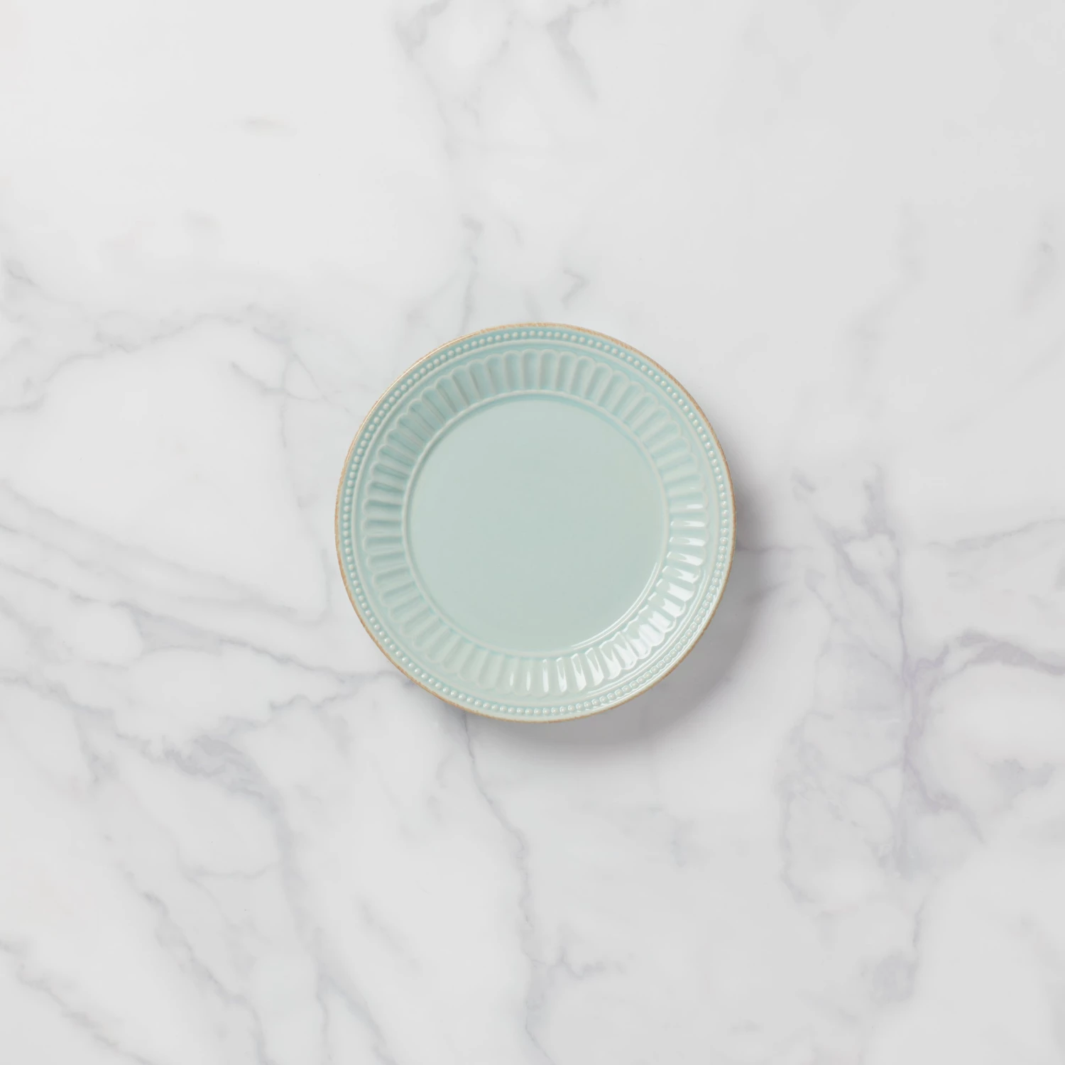 Intricate detailing inspired by hand-embroidered fabrics decorates the French Perle Groove Marine Dessert Plate.