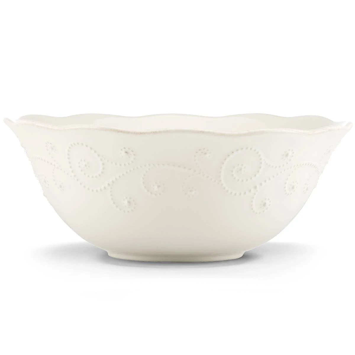 This large serving bowl, crafted of durable white ceramic stoneware, has a subtle contrast with the hand-applied tea stain along its scalloped rim, as swirling patterns of beads spin across the surface, adding grip and texture. This item is microwave and dishwasher-safe, for added convenience.