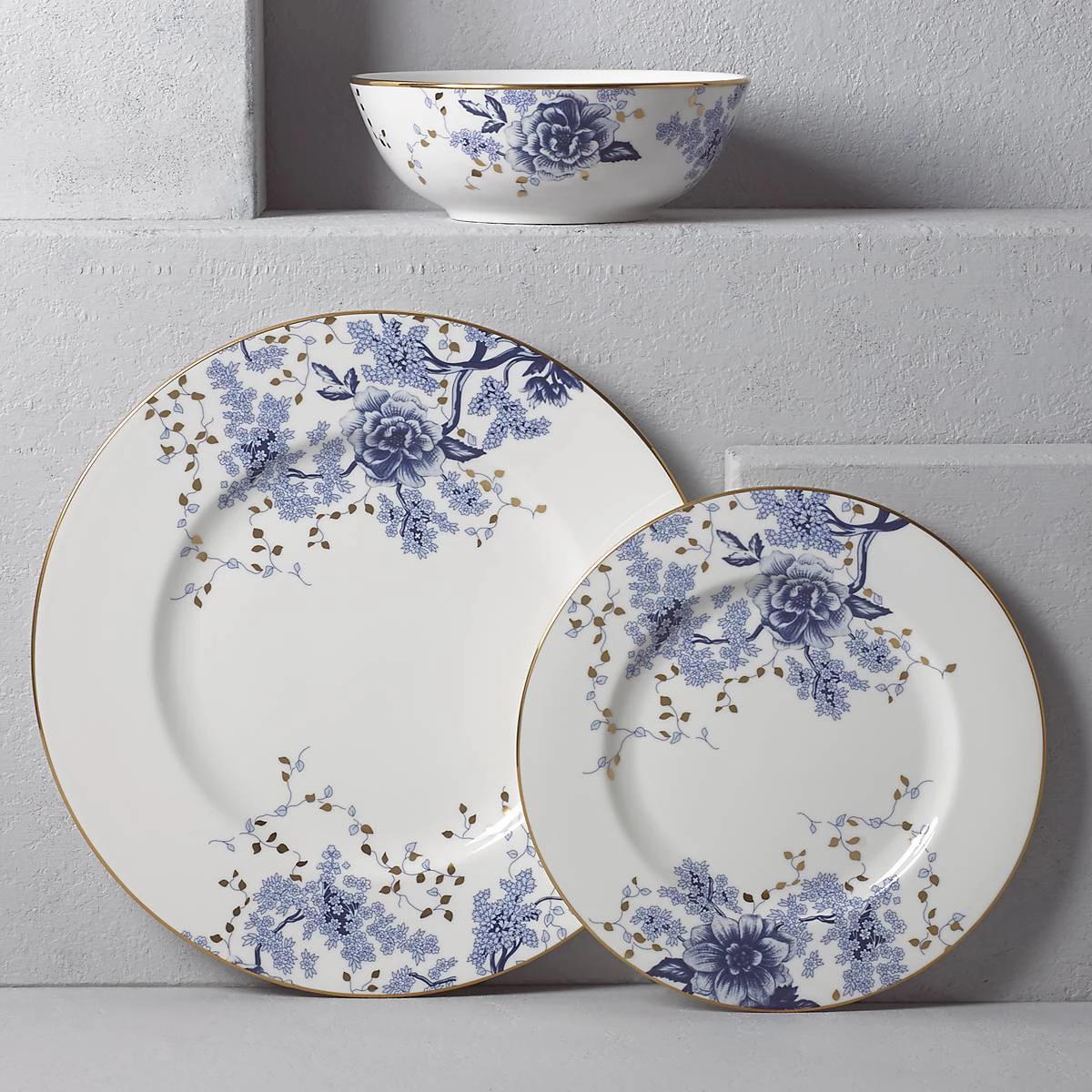 The Garden Grove 3-piece Place Setting includes a dinner plate, salad plate and bowl. This set evokes classic style with a navy blue floral pattern on durable white bone china, with 24-karat gold accents, bringing traditional sophistication to the table. Each piece is also dishwasher-safe.