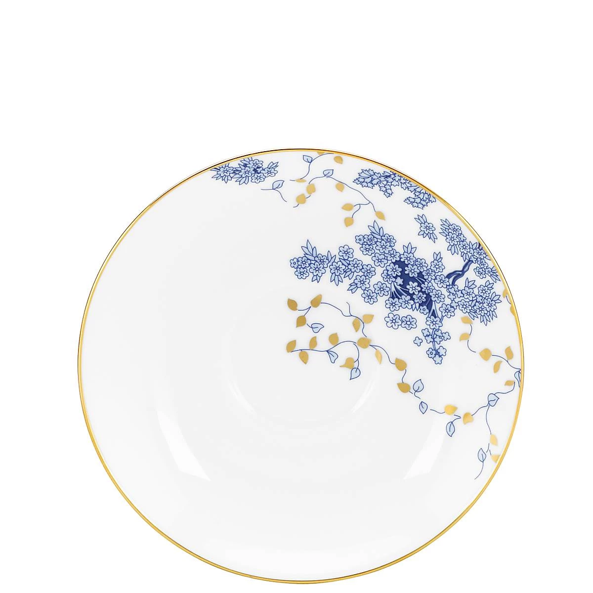 The Garden Grove Saucer adds poise and texture to an elegant tea time tablescape. A traditional blue blossom pattern is set over durable white bone china, with delicate gold botanical accents and a 24-karat gold trim. Saucer is dishwasher-safe.