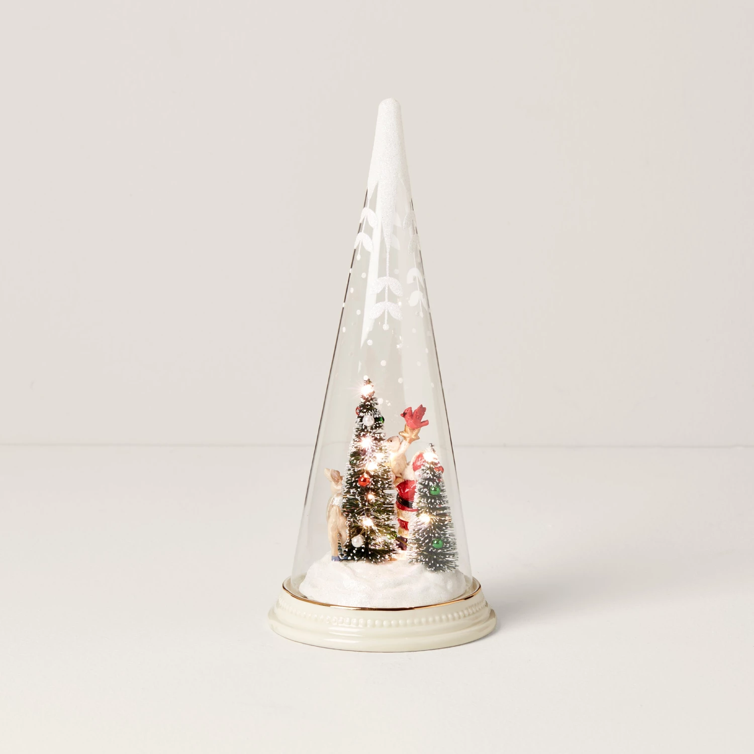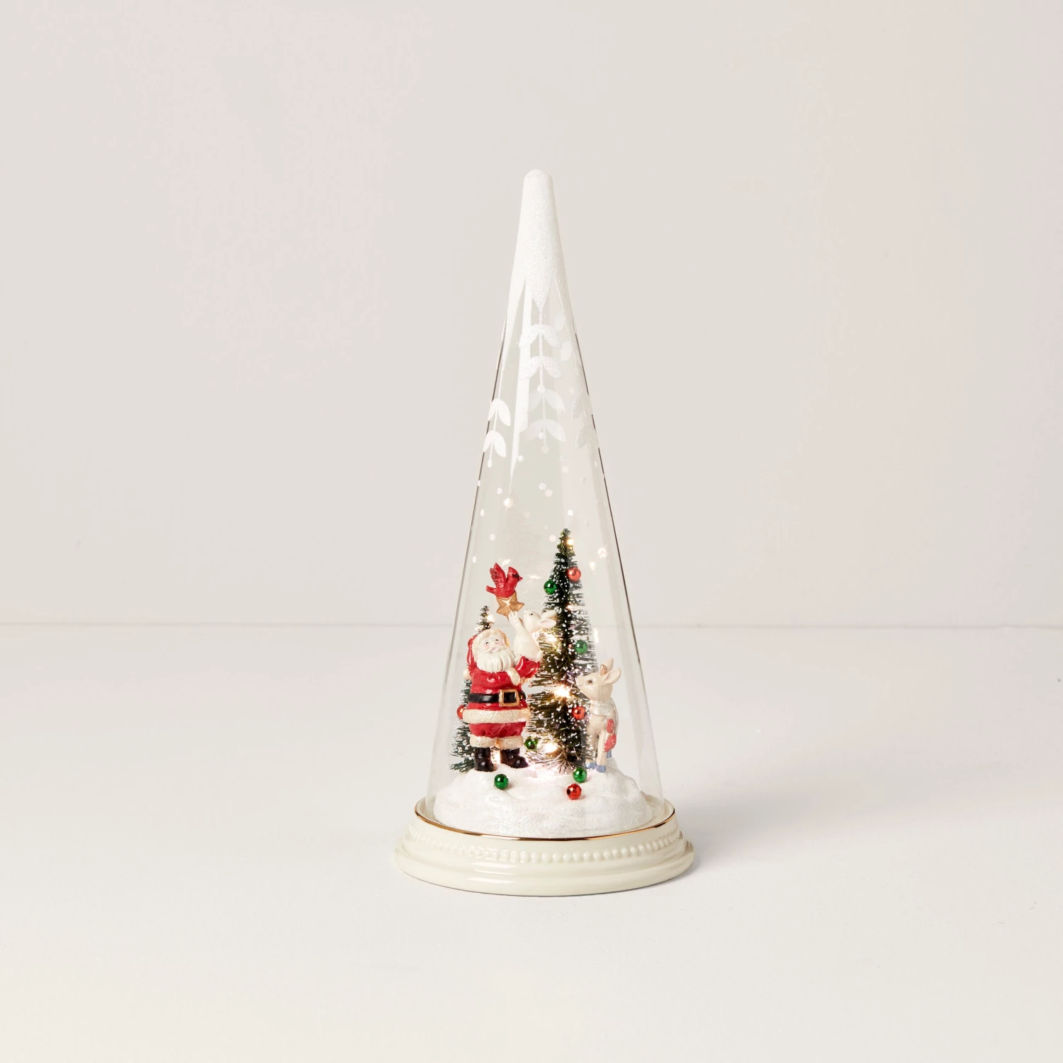 A charming winter scene unfolds with Santa and his woodland pals inside this light-up glass tree cone. It makes an elegant piece of Christmas decor and a treasured gift that no one will forget.