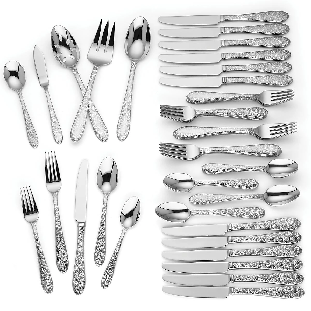 This 65-piece flatware set, crafted of 18/10 stainless steel, features a gentle hammered texture on the handle that adds grip and shimmer to the pieces. The curved bottom of the handles gives the set its classic feel that elevates everyday meals. This set includes twelve dinner forks, twelve dinner knifes, twelve salad forks, twelve tablespoons, twelve teaspoons, one serving spoon, one serving fork, one pierced serving spoon, one sugar spoon and one butter knife.