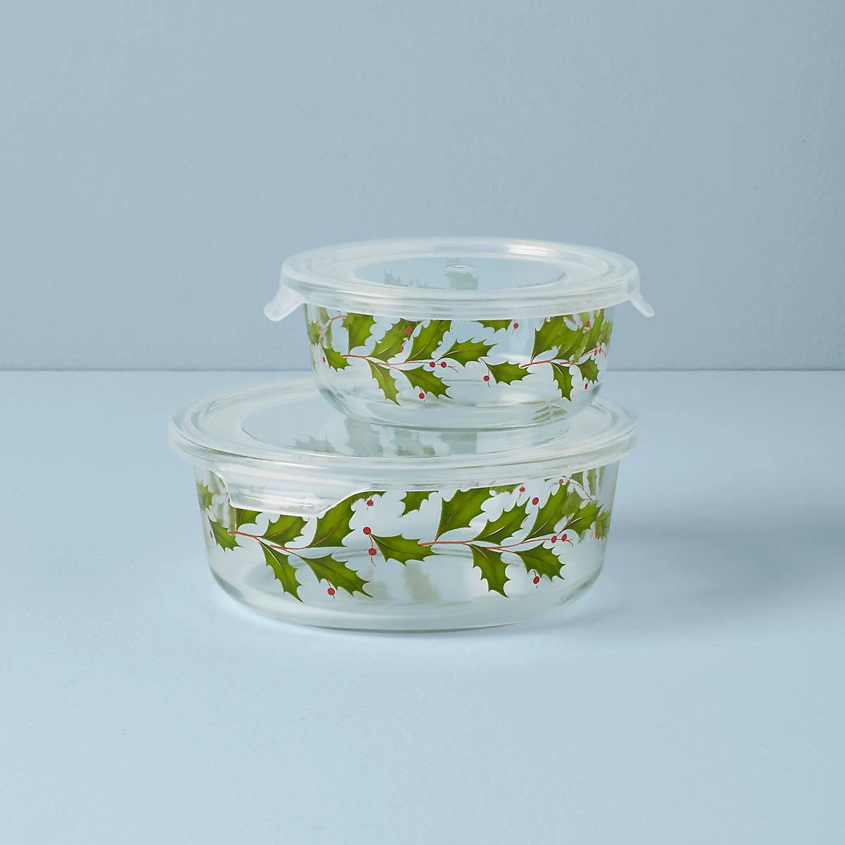 Send guests home with leftovers with this two-piece set of glass bowls in a charming holly leaf pattern.