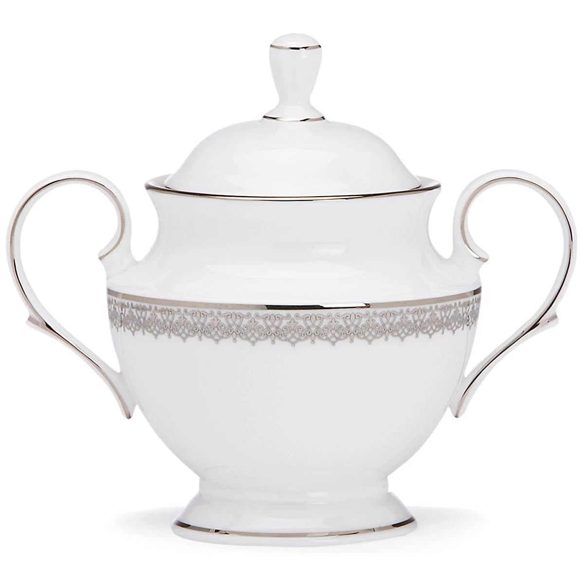 Ideal for a tea time for dessert course, the impressive Lace Couture Sugar Bowl is crafted of durable and pristine white bone china, and is framed by a laced motif that is similar to a rich tapestry. This ornate sugar bowl is accented in precious platinum, and is dishwasher-safe for added convenience.
