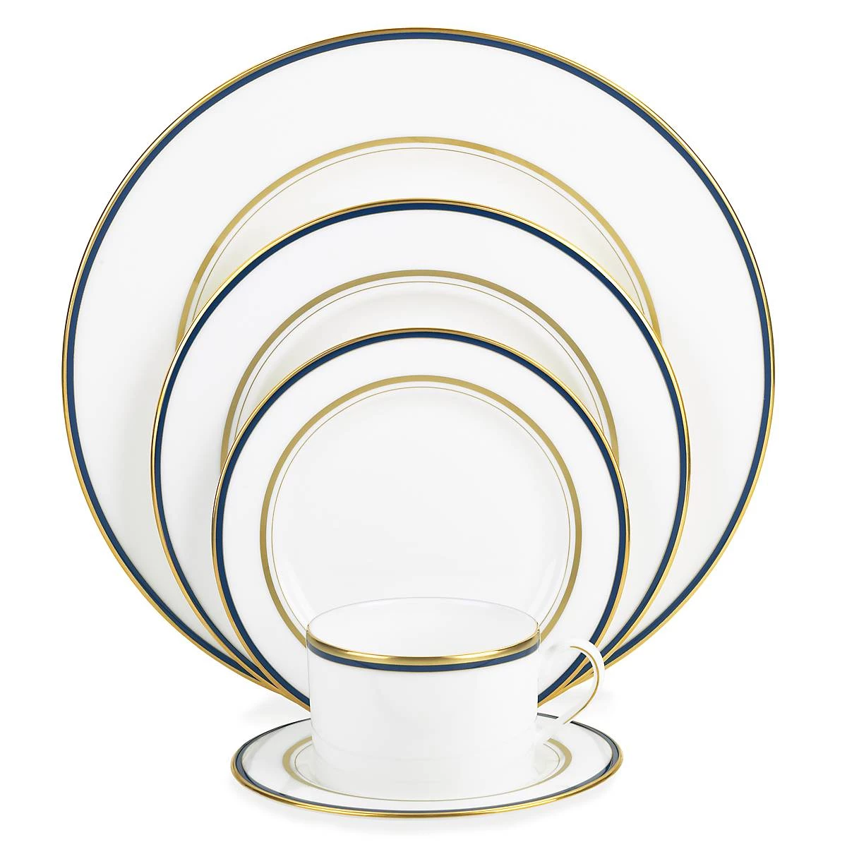 Bands of navy and platinum lend the Library Lane Navy Collection a sophisticated look. From Kate Spade New York, this 5-piece place setting is crafted of durable white bone china with precious platinum accents, and is dishwasher-safe.