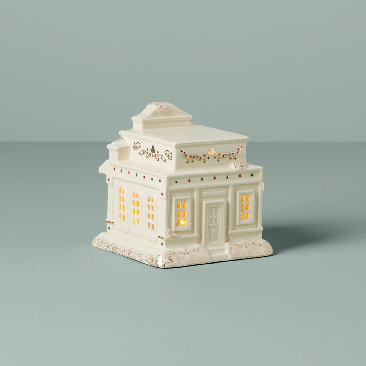 This light-up figurine is crafted in creamy porcelain and is softly illuminated from the inside to create a cozy atmosphere. Showcasing a charming ice cream parlor, it’s hand-decorated with 24k gold accents for a shining finish. It’s a charming addition to your Mistletoe Park Village Traditions collection.