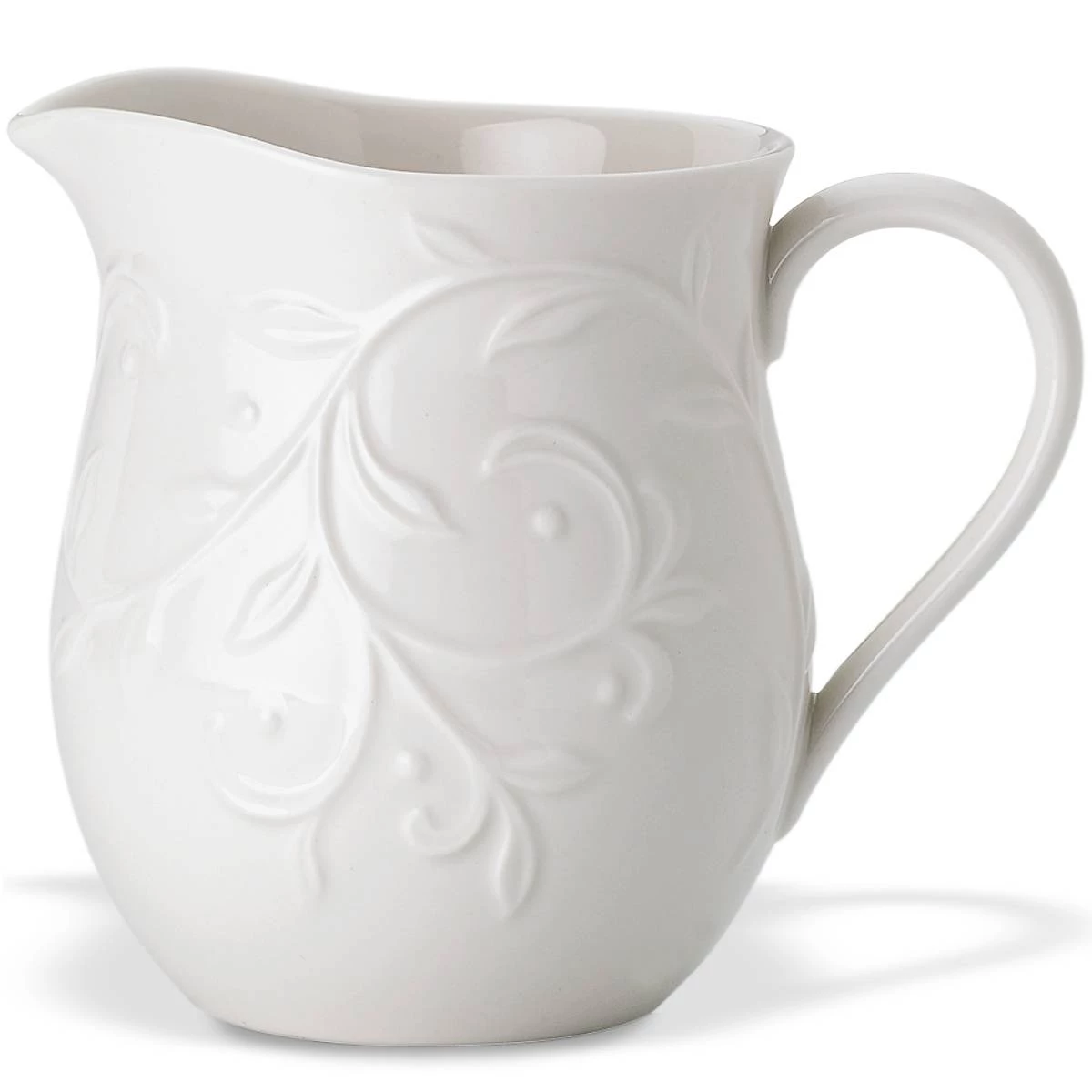 Ideal for tea times or dessert courses, the simply elegant Opal Innocence Carved Creamer features a flowing scroll motif in a raised relief on its pristine white rim. This casual and durable ceramic porcelain pitcher is also microwave and dishwasher-safe, for added convenience.