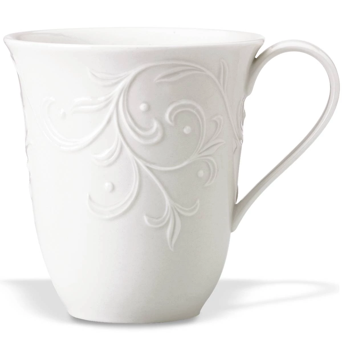 The simply elegant Opal Innocence Carved Mug features a flowing scroll motif in a raised relief on its pristine white rim. This casual and durable ceramic porcelain mug is also microwave and dishwasher-safe, for added convenience.