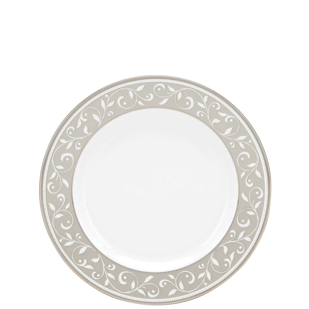 Ideal for use as a bread plate, the lavish and tranquil Opal Innocence Dune Bread Plate features a soft taupe frame and a delicate, scrolling dot motif of vines and leaves. This ornatescrolling dots and is accented in precious platinum, and is dishwasher-safe for added convenience.