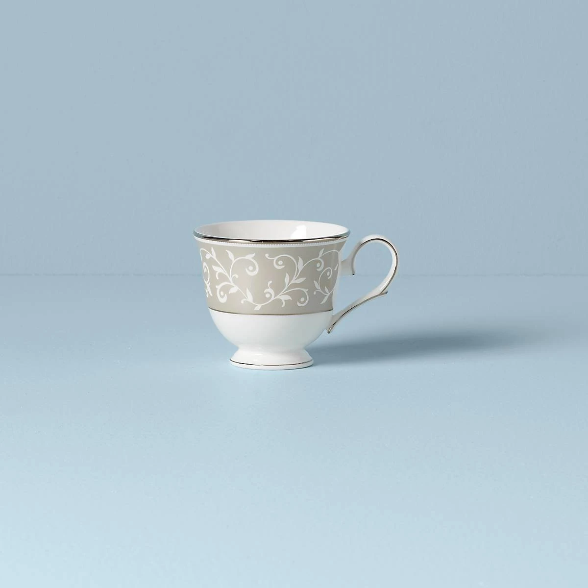 Ideal for an elegant and lavish tea time, the ornate and sophisticated Opal Innocence Dune Teacup features a scrolling dot motif of leaves and vines. This pristine white and pale taupe durable bone china tea cup is dishwasher-safe, and is accented in precious platinum.