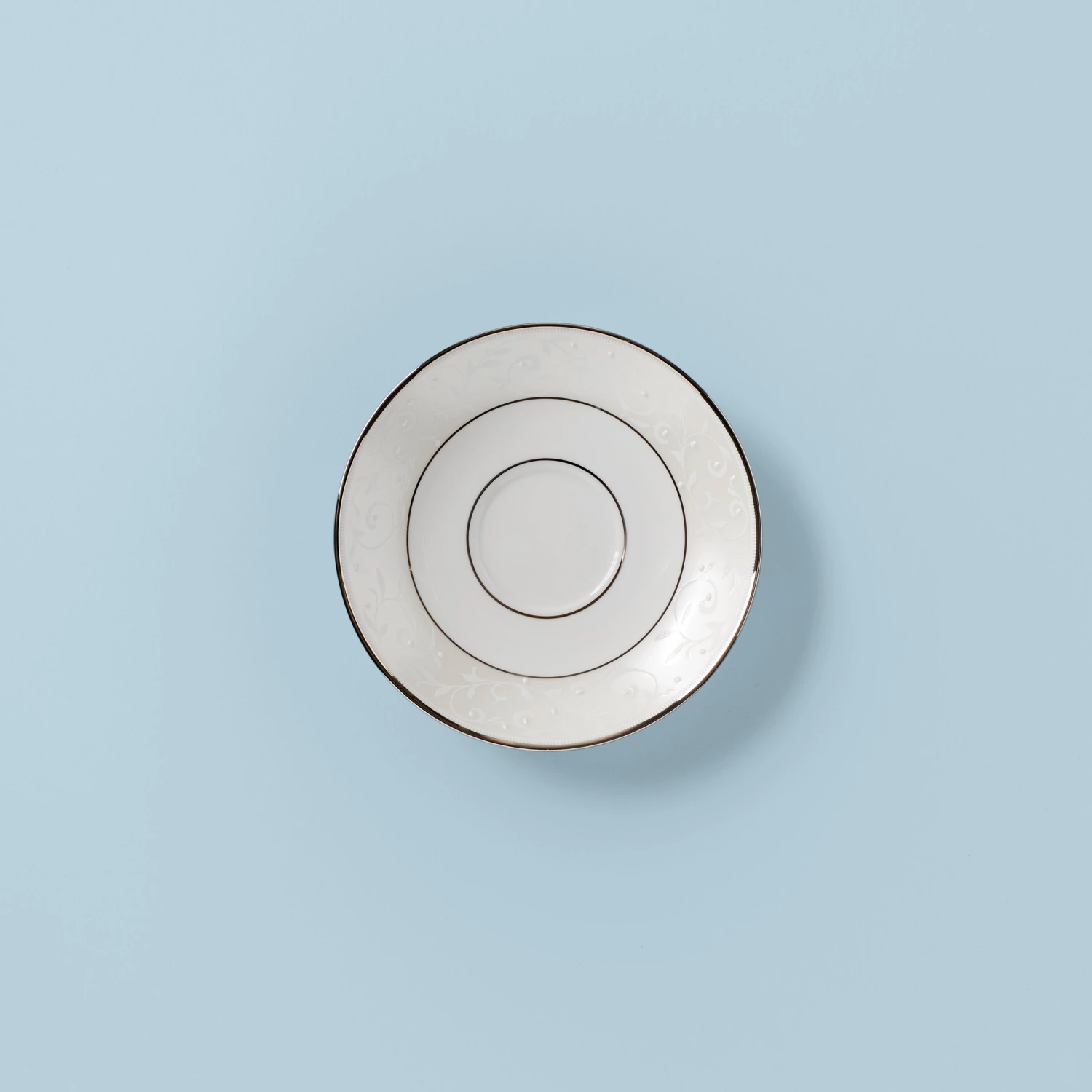 Ideal for an upscale and lavish tea time, rest a teacup on the elegant and serene Opal Innocence Blue Saucer. This dishwasher-safe, durable bone china saucer features a soft blue motif of scrolling dots, and is accented in precious platinum.