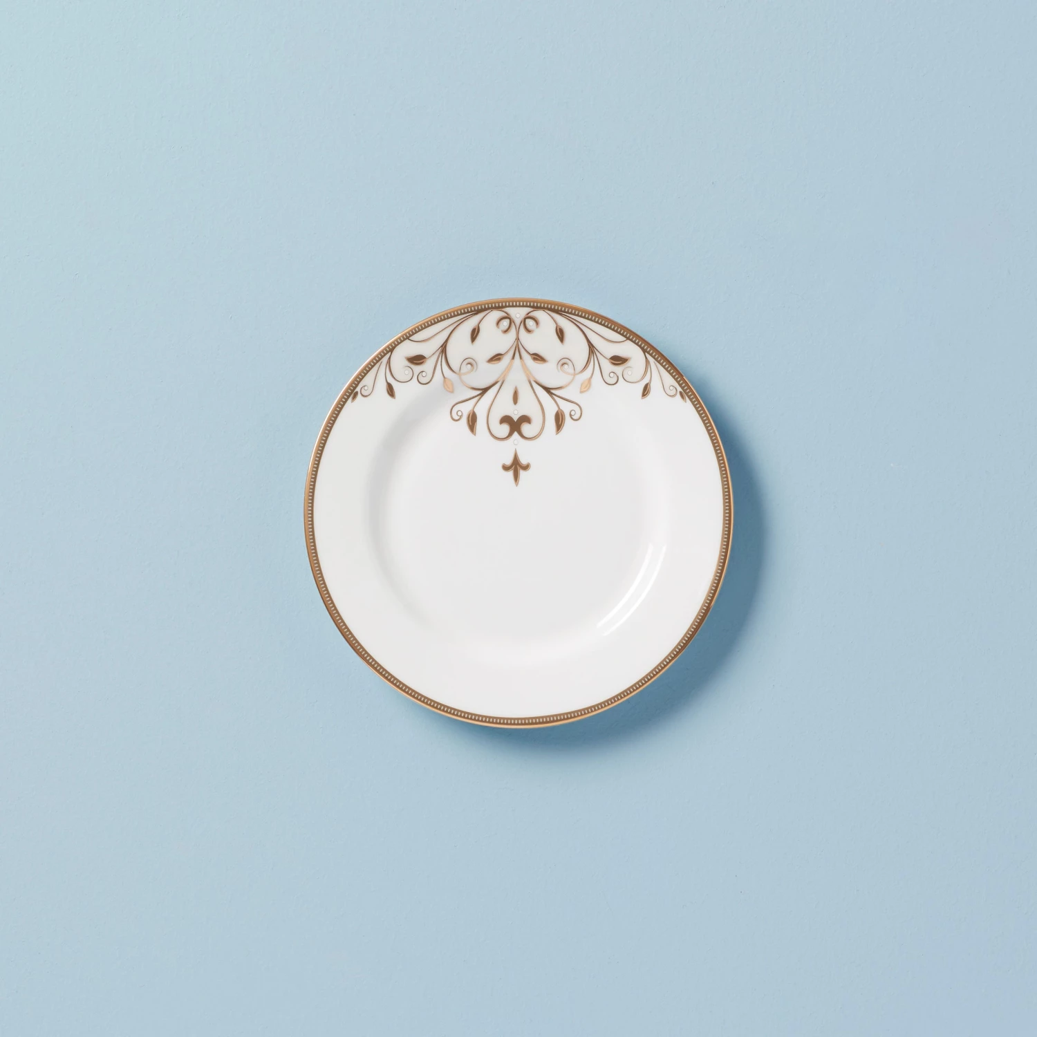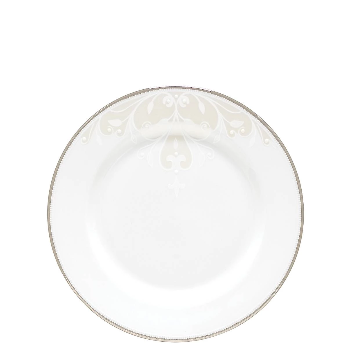 A shimmering scroll motif decorates the pristine white surface of this ornate and stylish Opal Innocence Scroll bread plate. This elegant and durable bone china plate is accented in precious 24k gold and is dishwasher safe for added convenience.