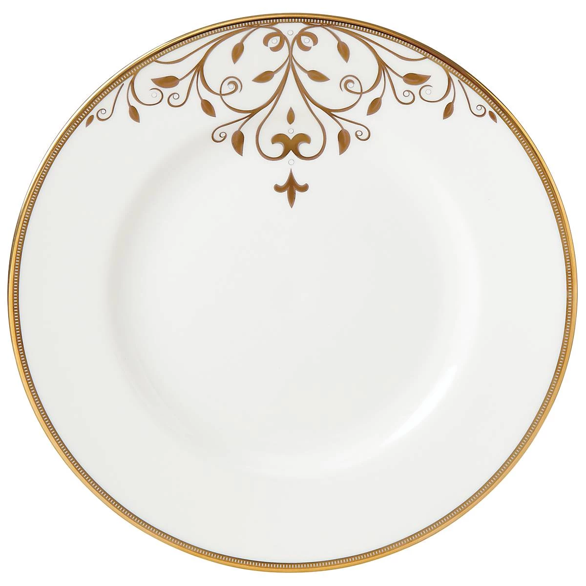 The ornate and stylish Opal Innocence Scroll Gold Dinner Plate features a shimmering white mica scroll motif. This elegant and durable bone china plate is accented in precious 24-karat gold, and is dishwasher-safe for added convenience.