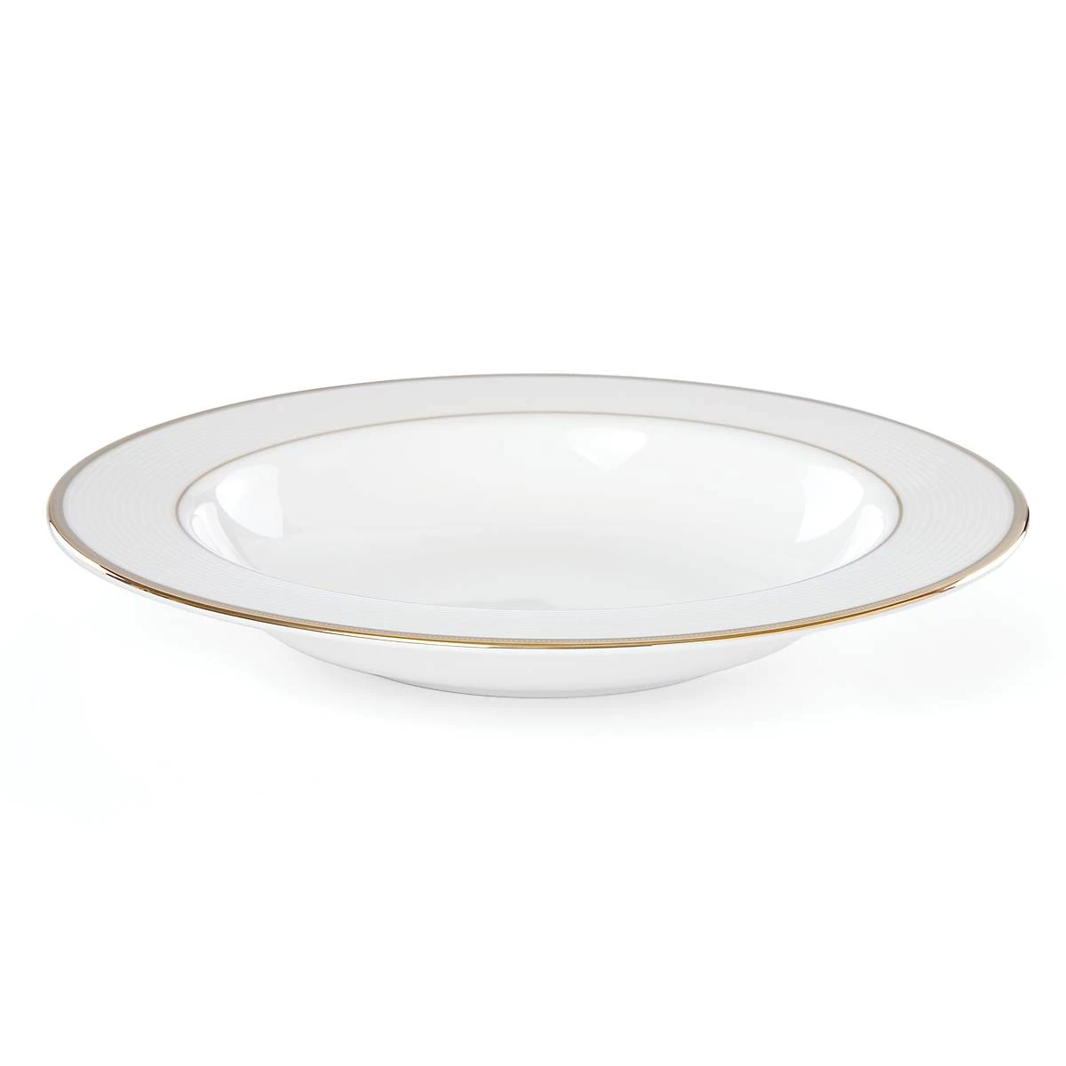 The elegant and versatile Opal Innocence Stripe Gold Rimmed Bowl features convenient wide rims for easy handling, and features a textured motif of raised white ribbons. This ornate and durable bone china soup bowl is accented in precious 24-karat gold accents, and is dishwasher-safe for added convenience.