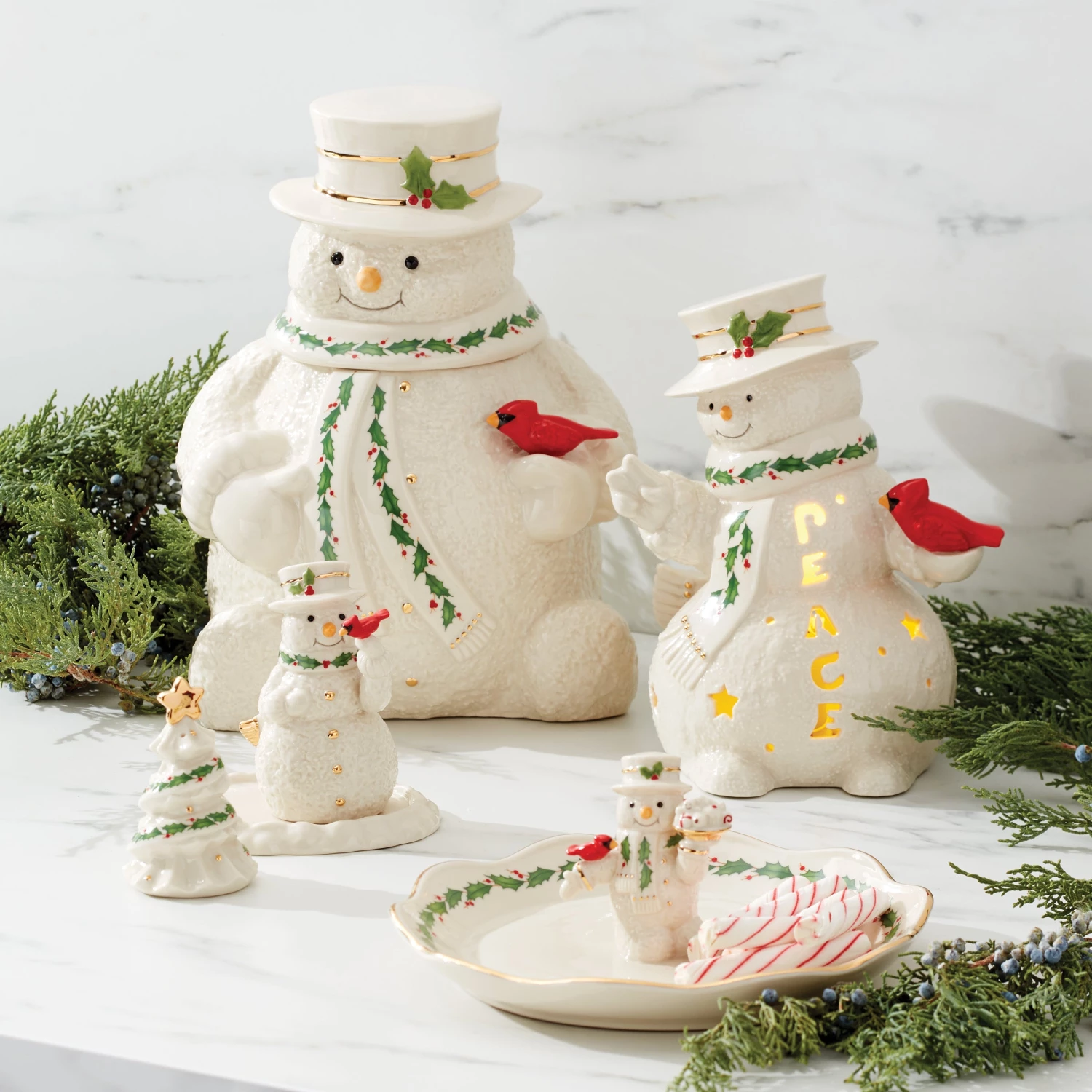 Keep it bright and light with this snowman figurine. A red cardinal perches on his glove and the word, “Peace,” glows from candlelight. Featuring holly leaf accents and little touches of 24k gold.