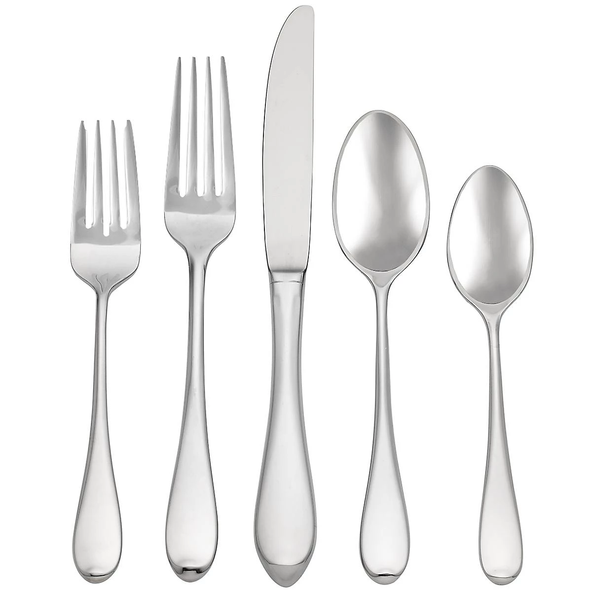 The Studio 5-piece Place Setting by Gorham exhibits a sleek design with classic teardrop handles. This elegant design showcases the flatware’s polished 18/10 stainless steel, and includes a dinner fork, dinner knife, salad fork, tablespoon, and teaspoon.