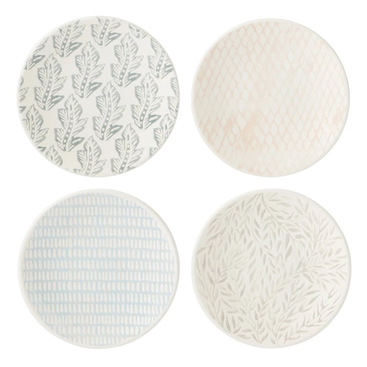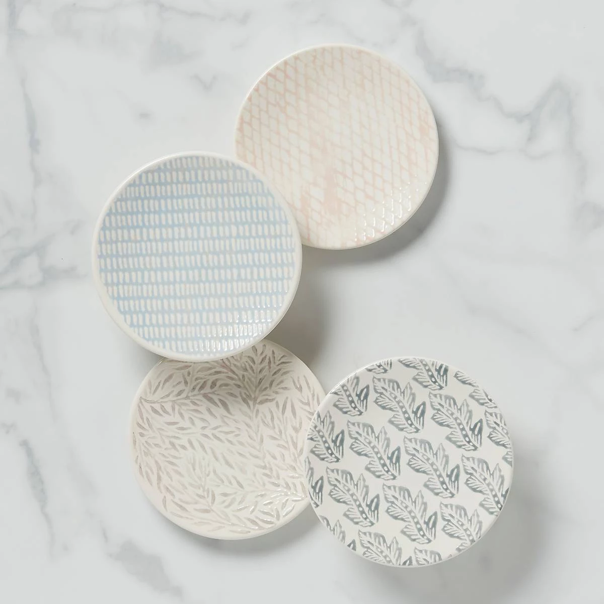 Enjoy appetizers or sides with the Textured Neutrals tidbit plate set. Perfect for year-round gatherings, the organic patterns and subdued hues bring a natural style to your table.