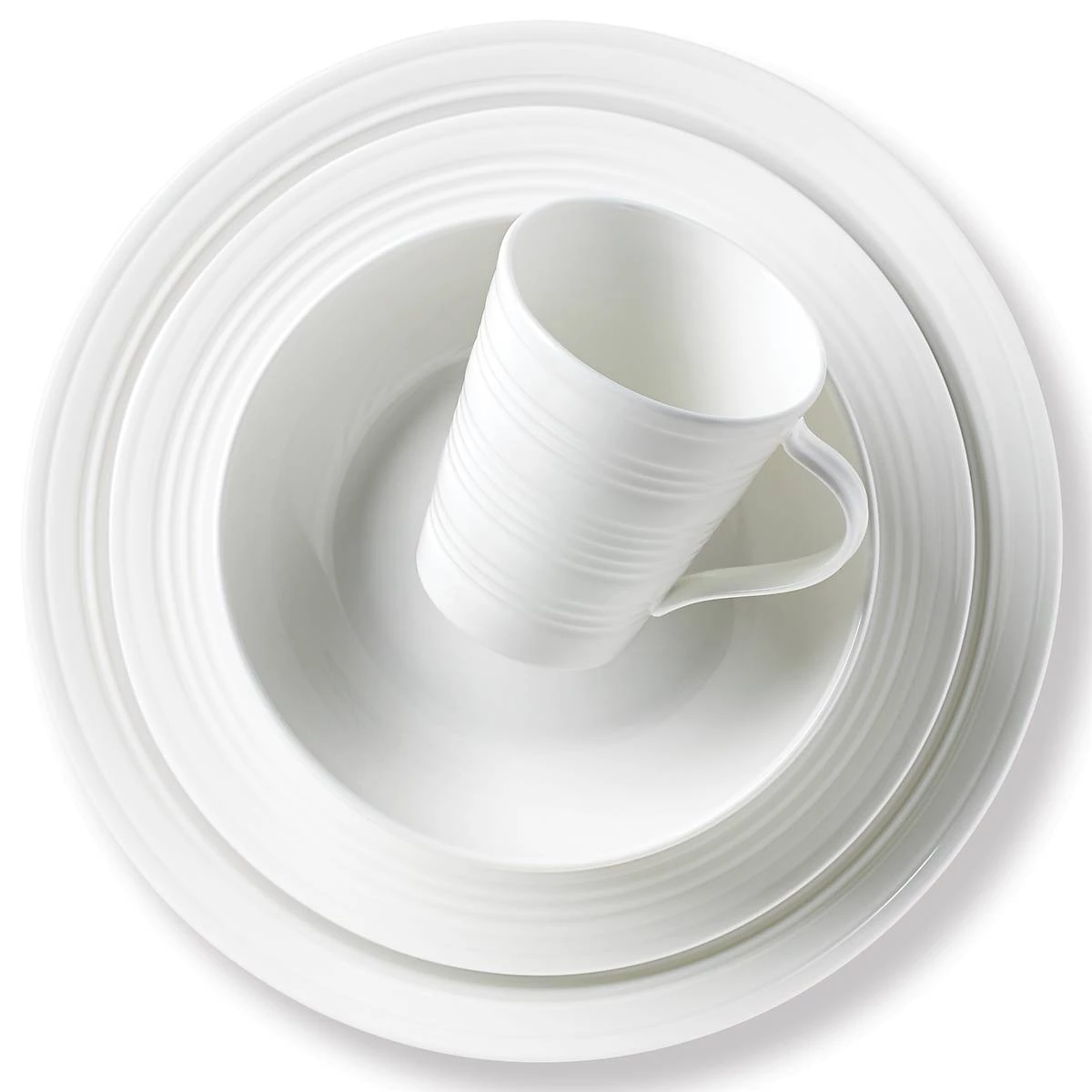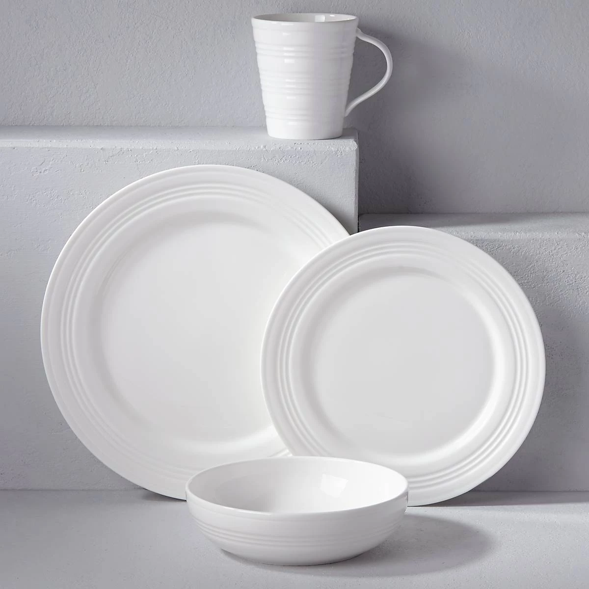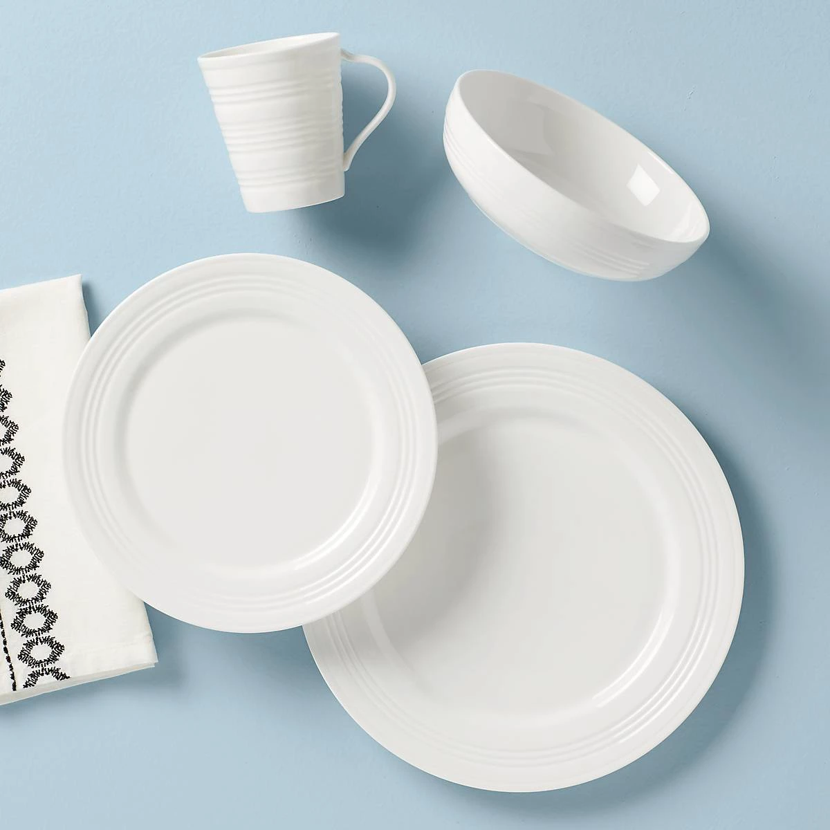 This dishwasher and microwave-safe set suits any occasion and complements a variety of dinnerware styles. The Tin Can Alley 4-Piece Dinnerware Set adopts the tin can’s emblematic corrugated rings on durable white porcelain for a simple, aesthetic design.