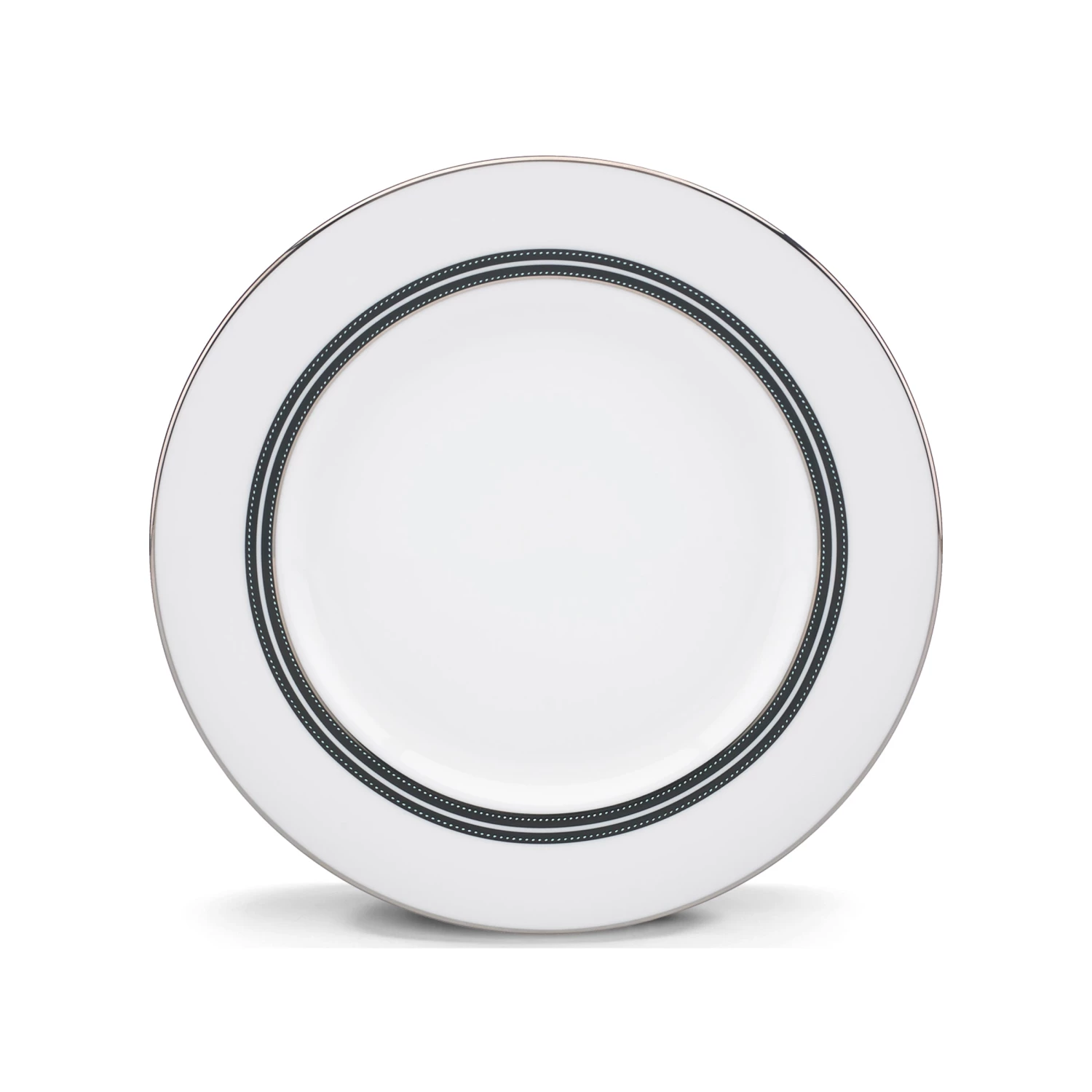 White raised “stitches” with black banding and platinum details give the kate spade new york Union Street Salad Plate a sophisticated look. This is chic bone china dinnerware, perfect for any occasion.
