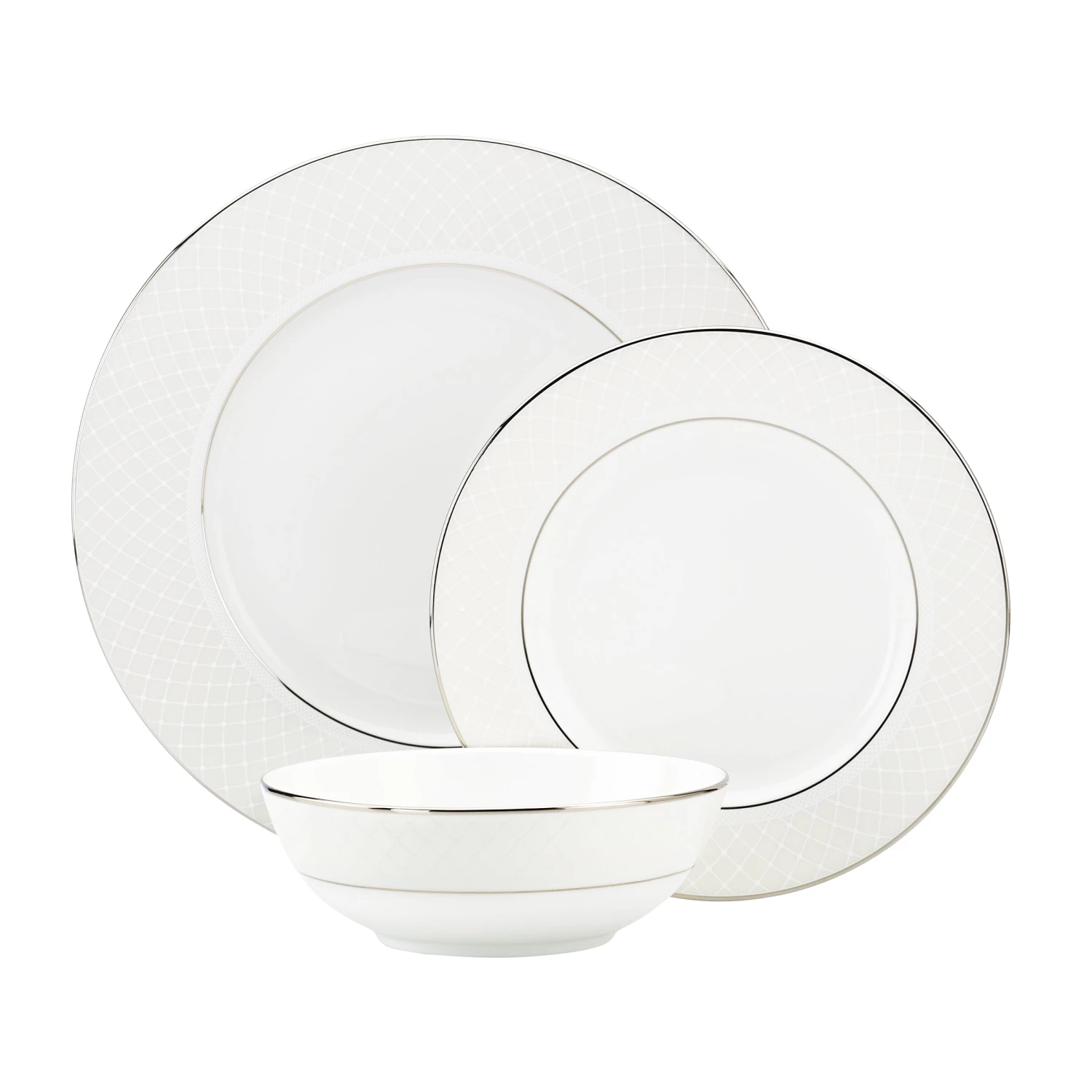 This three-piece place setting includes a lace pattern along its outer border, as well as a shimmering band of precious platinum that adds a hint of grace to the table. Crafted of durable bone china, this item is dishwasher-safe, for added convenience.
