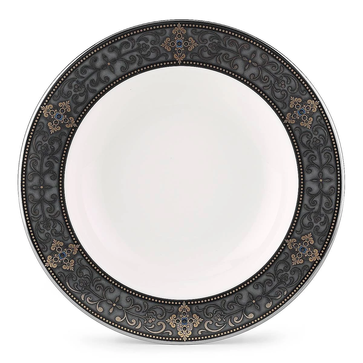 This Vintage Jewel rimmed soup bowl features an ornate black-and-gold pattern of scrollwork along its border, as well as accents of 24-karat gold and precious platinum. The enamel beading gives the piece, made of durable white bone china, its texture. This item is dishwasher-safe, for added convenience.