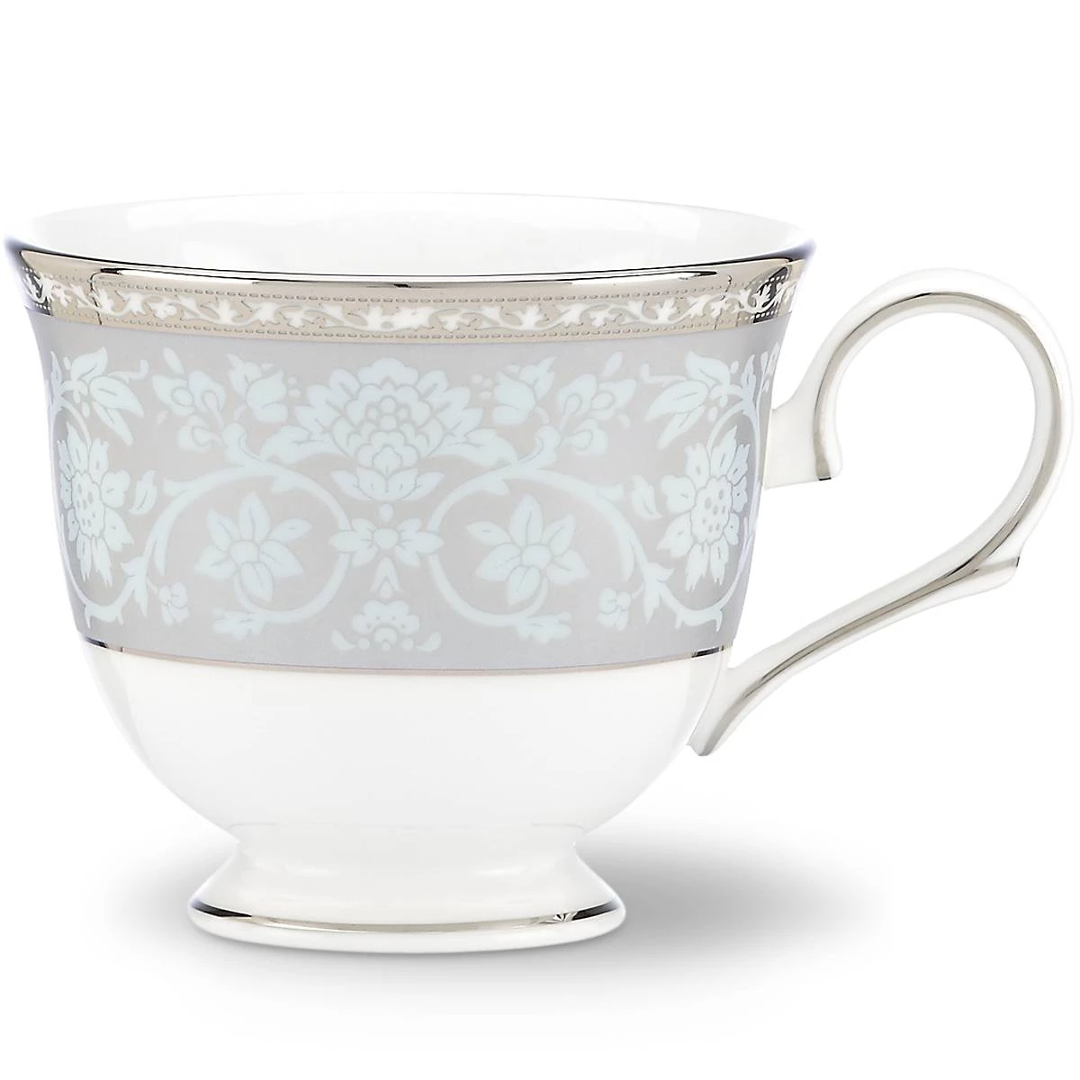 This sturdy cup glows with bands of precious platinum accents, against its durable white bone china exterior, as a stripe of light blue lace floral patterns swirls around its side, adding texture and color. This item is dishwasher-safe, for added convenience.