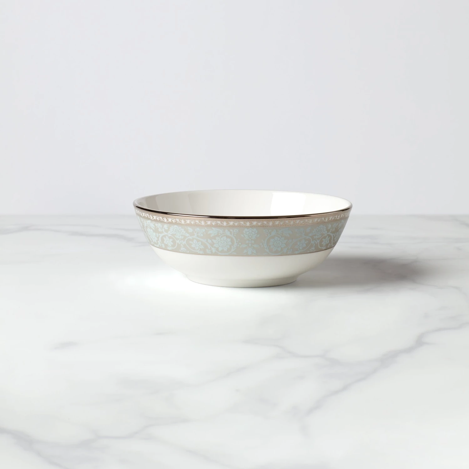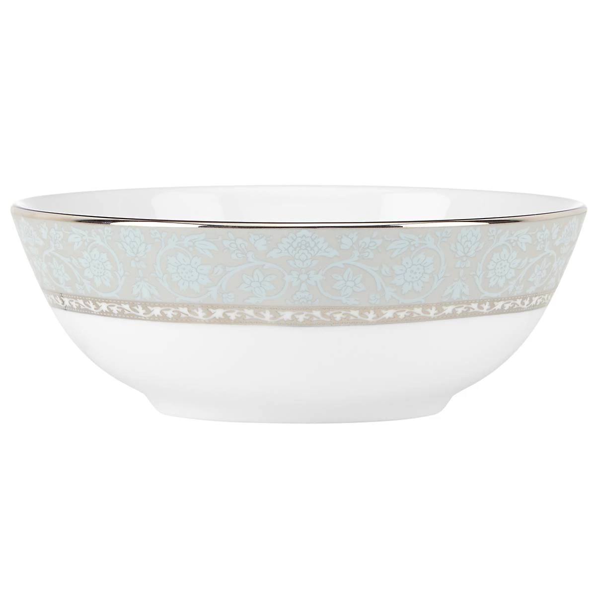 Featuring a texture of lace florals in sky blue along its side, trimmed in precious platinum, this durable white bone china place setting bowl is the ideal complement to springtime meals with friends and family. This item is dishwasher-safe, for added convenience.