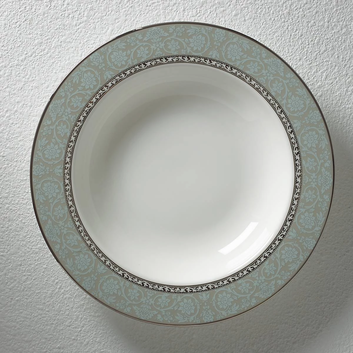 Trimmed with bands of precious platinum, this durable bone china rimmed soup bowl is a cool, smooth white, contrasted by delicate lace florals and scrolls in a soft sky blue, that adds subtle color and texture. This item is dishwasher-safe, for added convenience.