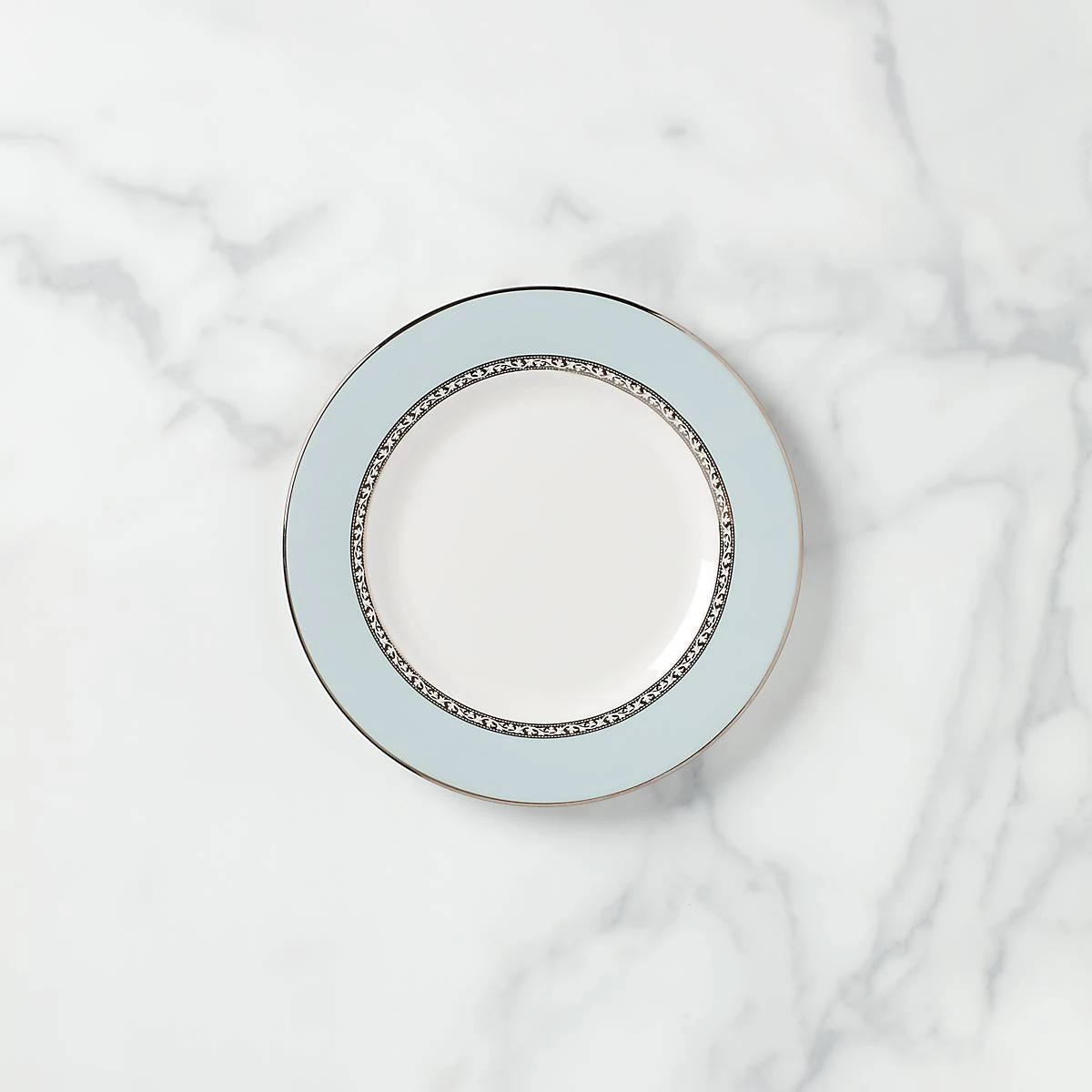 This durable bone china salad plate, trimmed with bands of precious platinum and featuring a soft band of sky blue against crisp white, is ideal for serving guests an elegant lunch or early dinner. This item is dishwasher-safe, for added convenience.
