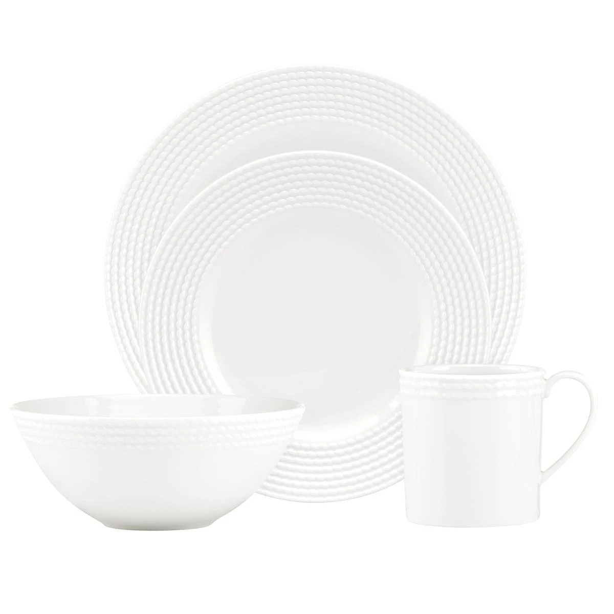 Timeliness with a subtle twist, the Wickford Collection is adorned with a textured rope motif. From Kate Spade New York, the Wickford 4-piece Place Setting is crafted of durable white ceramic porcelain, and is microwave and dishwasher-safe.