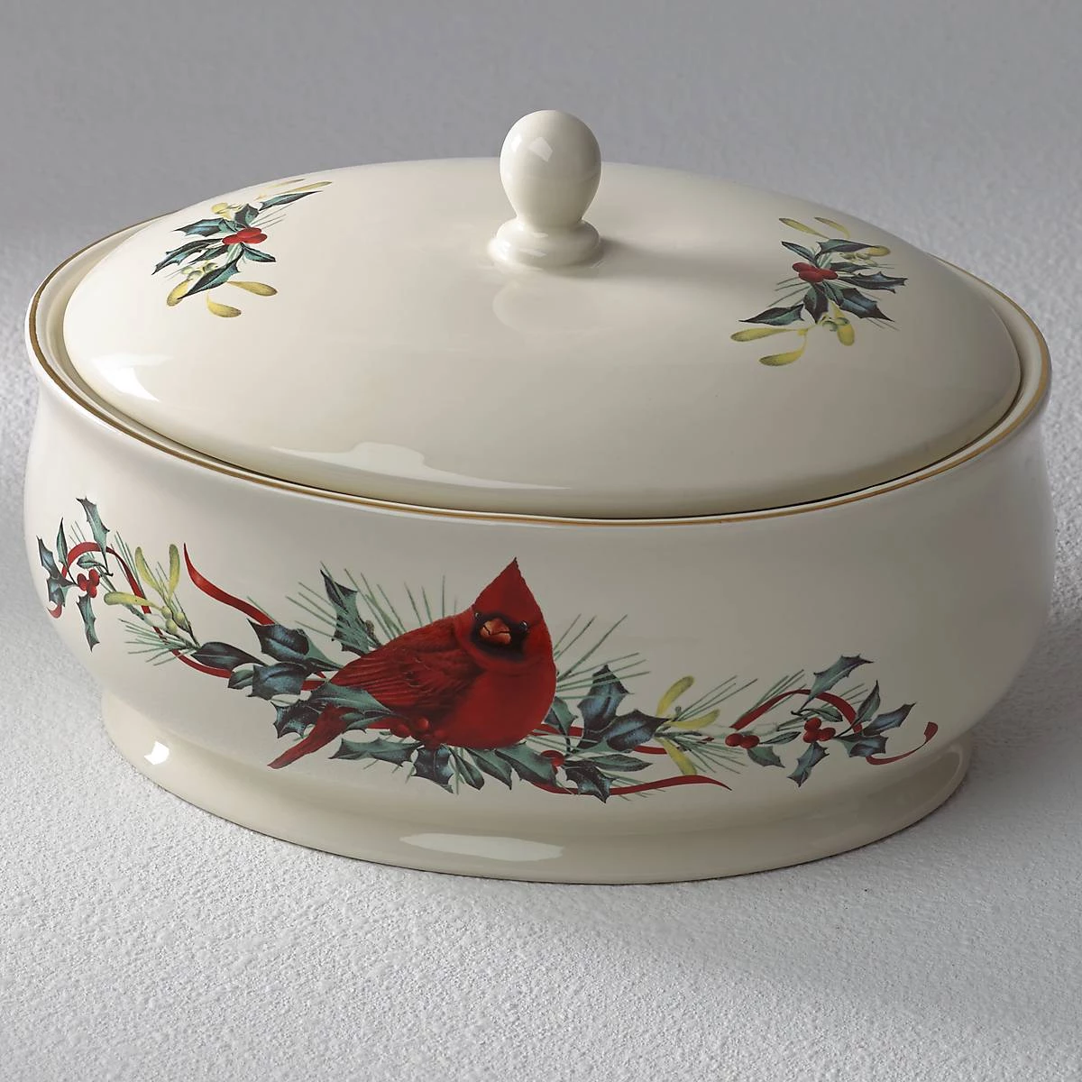 Serve casseroles, side dishes and more with this festive ceramic covered dish. A friendly red cardinal bird is perched on a branch inviting guests to partake of the delicious food within. Features beautiful 24-karat gold accents for a glistening finish.