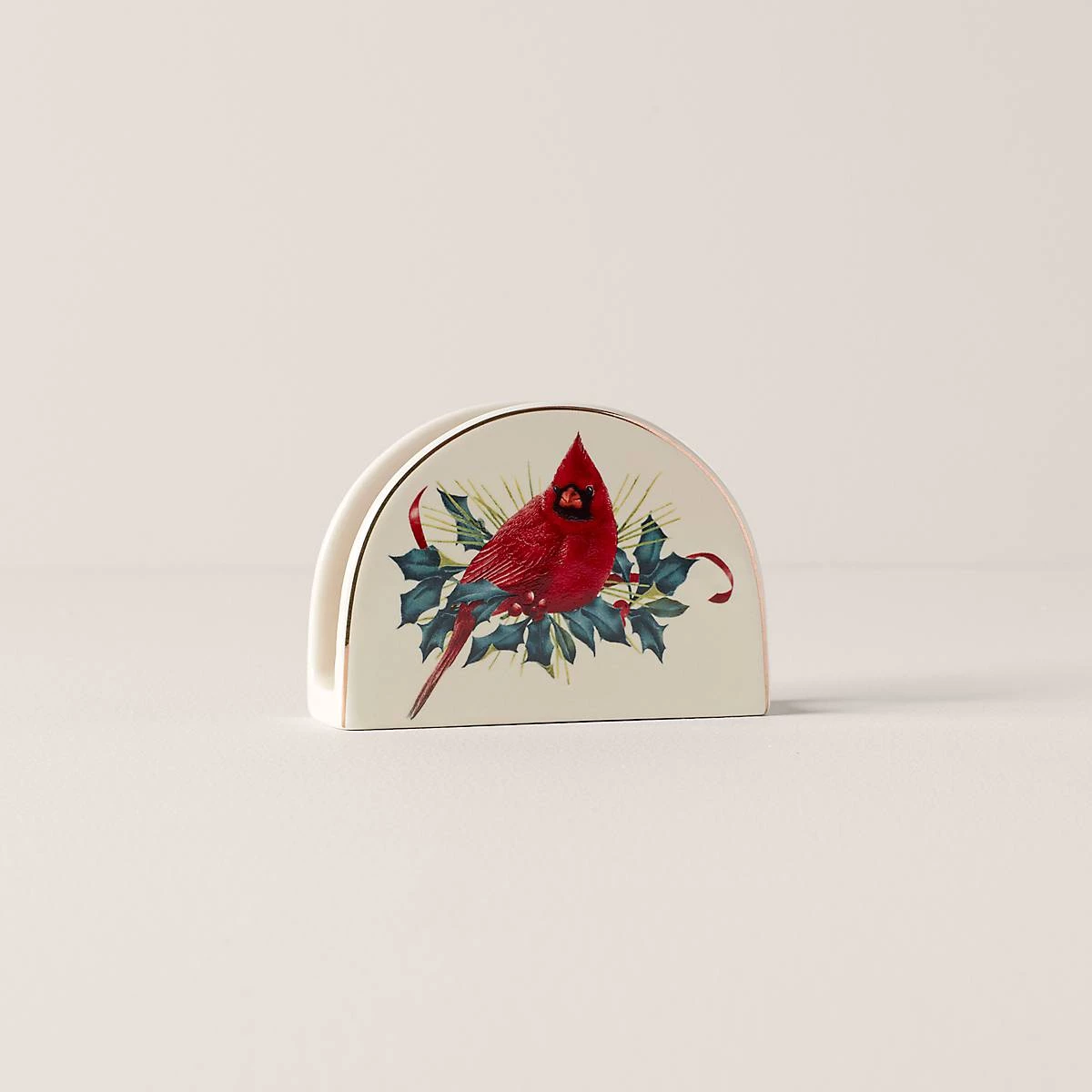 Adorned with 24-karat gold accents, this porcelain napkin holder is a whimsical addition to your holiday table. A brilliant red cardinal and intricate painted details give this piece its festive charm.