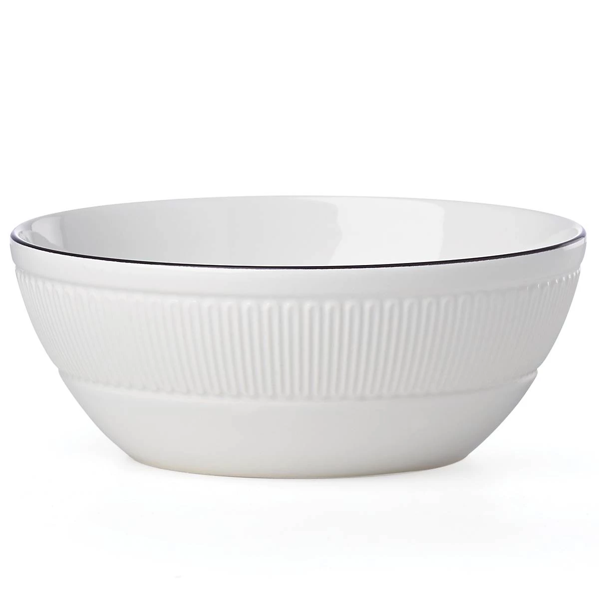 Grosgrain detailing, rich black trim, and a crisp white finish highlight this chic dinnerware from Kate Spade New York. Crafted from durable ironstone, the York Avenue Soup Bowl is microwave and dishwasher-safe.